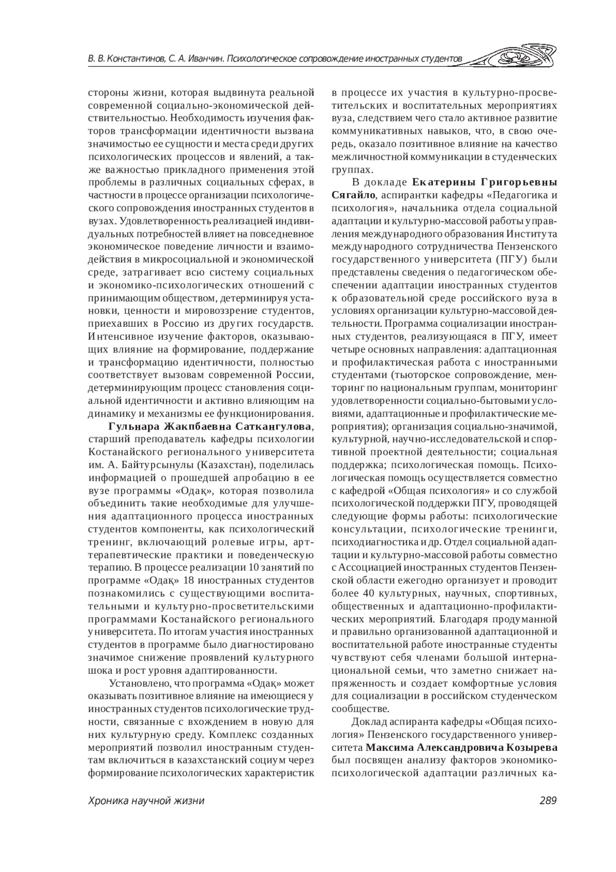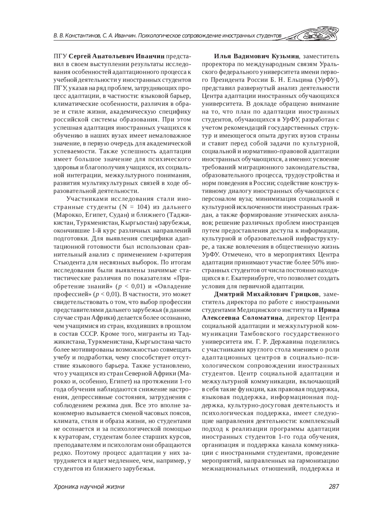 Результаты: Участники, среди которых были представители вузовских структур, ответственных за организацию адаптационного процесса иностранных студентов, представители общественных организаций, иностранные студенты, преподаватели вузов, обсудили вопросы теории и практики психологического сопровождения иностранных студентов, получающих образование в российских вузах. Оригинальность и новизна: межрегионального круглого стола были определены форматом проведения мероприятия, содержанием докладов и составом участников. В работе круглом столе приняли участие представители Российской Федерации, Казахстана, Китая, Индии, Марокко, Египта, Узбекистана, Кыргызстана, Таджикистана и Туркменистана.