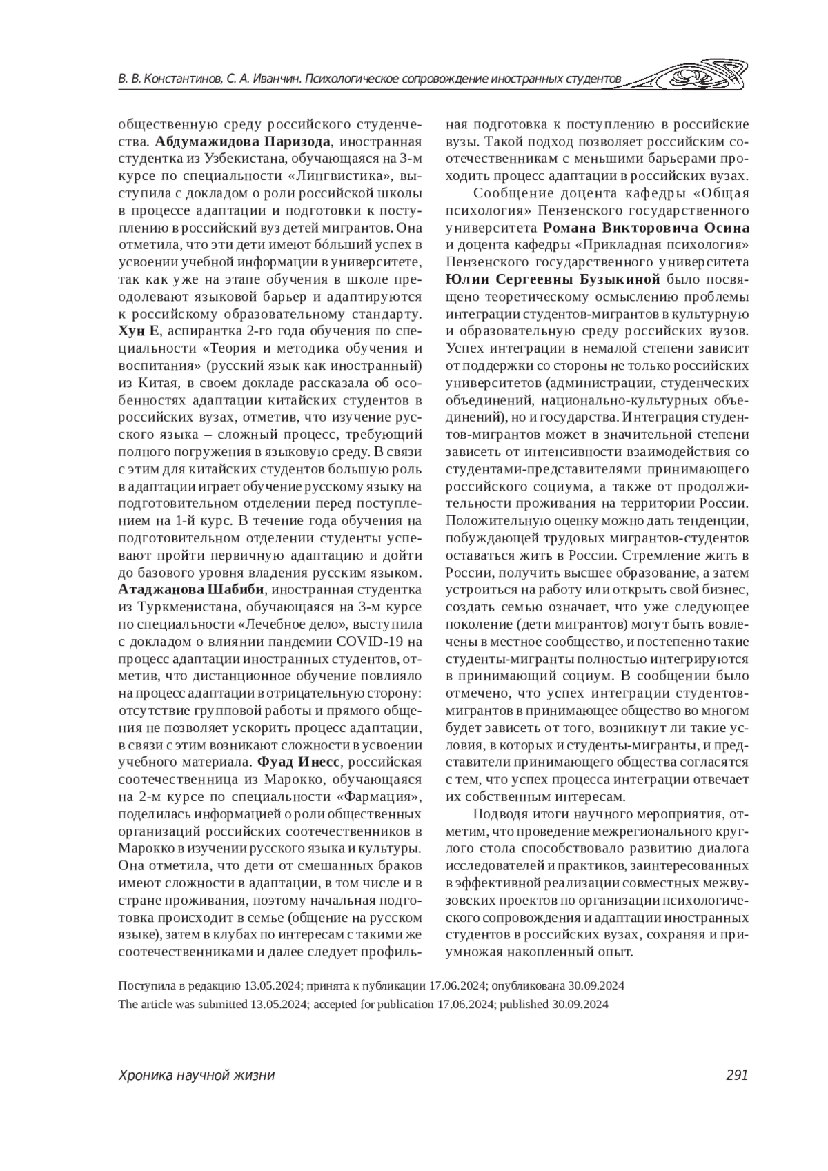 Актуальность исследования определяет необходимость содействия поиску инструментов, повышающих эффективность психологического сопровождения и адаптации иностранных студентов в российских вузах, что стало главной идеей межрегионального круглого стола «Психологическое сопровождение иностранных студентов в российских вузах» (Пензенский государственный университет, 25 апреля 2024 г.).