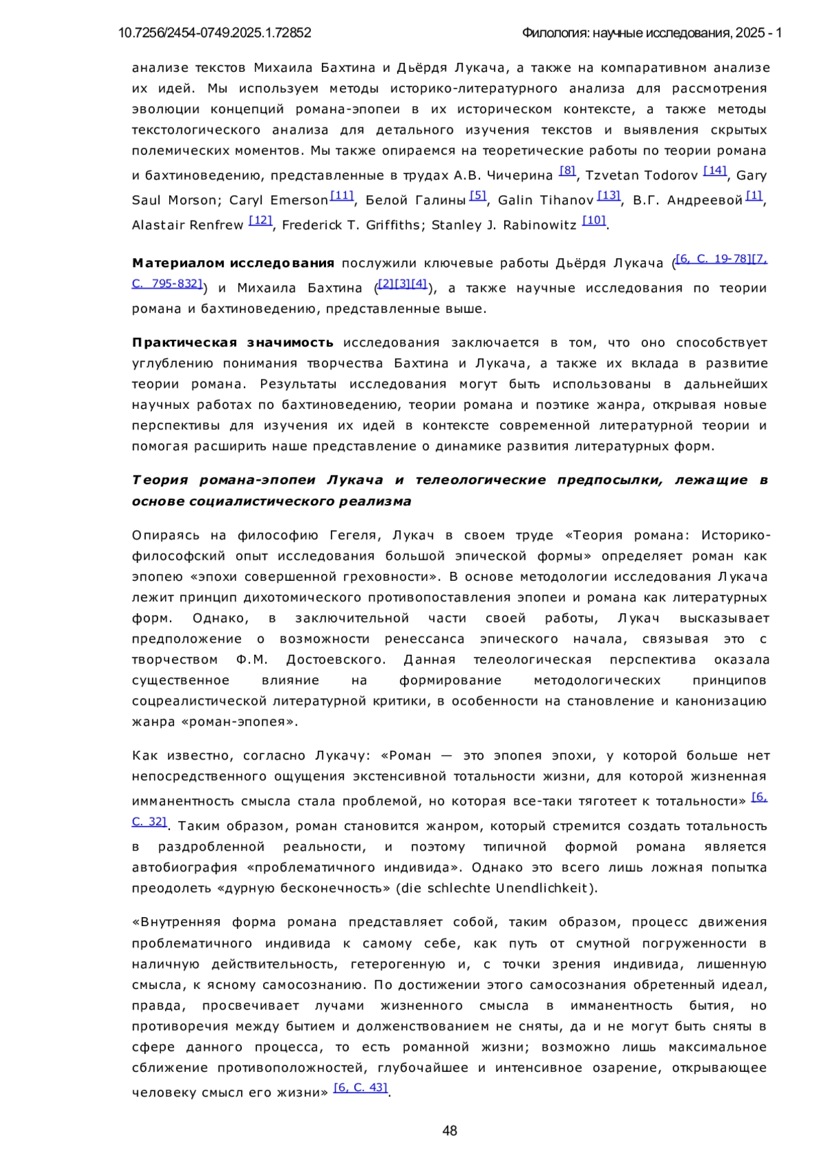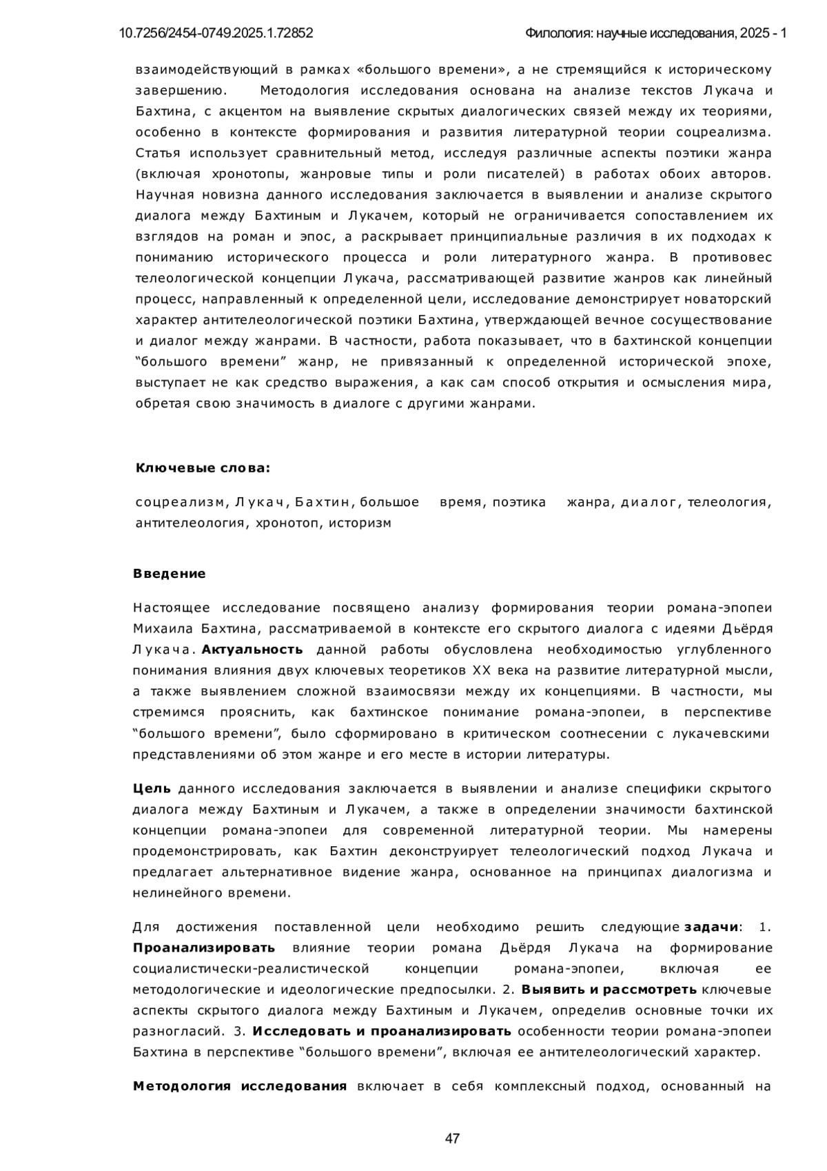 Предметом исследования в данной статье является скрытый диалог между философско-литературными теориями Михаила Бахтина и Дьёрдя Лукача, развернувшийся на фоне формирования и развития социалистического реализма. В центре внимания находится анализ того, как, полемизируя с телеологическими предпосылками, лежащими в основе системы Лукача и соцреалистической доктрины, Бахтин формирует свою концепцию поэтики романа в перспективе «большого времени». Исследование сосредоточено на рассмотрении контрастных подходов к пониманию жанра, где Лукач, опираясь на философию истории, выстраивает линейную и телеологическую модель развития жанров, завершающуюся в социалистическом реализме, а Бахтин, вступая в скрытую полемику, разрабатывает антителеологическую, пространственно-временную поэтику. Особое внимание уделяется тому, как Бахтин, перемещая фокус с исторической философии на уровень текста, предлагает диалогическую интерпретацию жанров, в которой каждый из них, включая роман и эпос, предстает как уникальный и вечный способ осмысления мира, сосуществующий и взаимодействующий в рамках «большого времени», а не стремящийся к историческому завершению. Методология исследования основана на анализе текстов Лукача и Бахтина, с акцентом на выявление скрытых диалогических связей между их теориями, особенно в контексте формирования и развития литературной теории соцреализма. Статья использует сравнительный метод, исследуя различные аспекты поэтики жанра (включая хронотопы, жанровые типы и роли писателей) в работах обоих авторов. Научная новизна данного исследования заключается в выявлении и анализе скрытого диалога между Бахтиным и Лукачем, который не ограничивается сопоставлением их взглядов на роман и эпос, а раскрывает принципиальные различия в их подходах к пониманию исторического процесса и роли литературного жанра. В противовес телеологической концепции Лукача, рассматривающей развитие жанров как линейный процесс, направленный к определенной цели, исследование демонстрирует новаторский характер антителеологической поэтики Бахтина, утверждающей вечное сосуществование и диалог между жанрами. В частности, работа показывает, что в бахтинской концепции “большого времени” жанр, не привязанный к определенной исторической эпохе, выступает не как средство выражения, а как сам способ открытия и осмысления мира, обретая свою значимость в диалоге с другими жанрами.