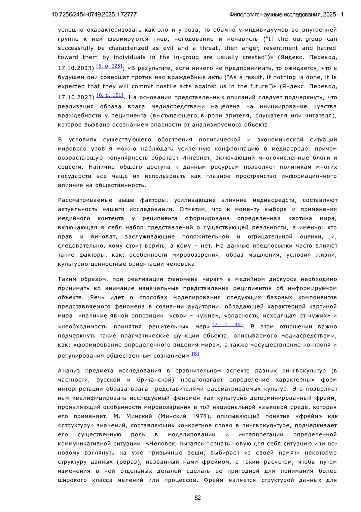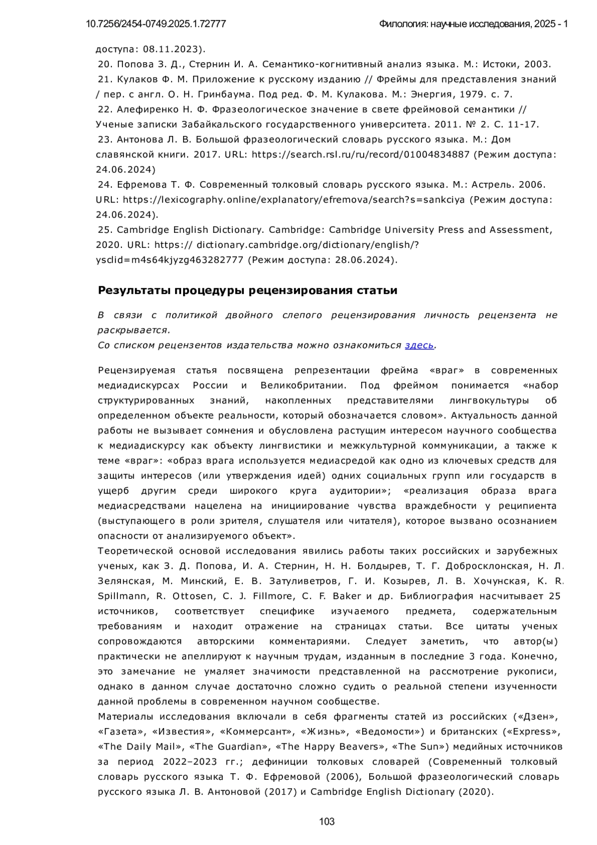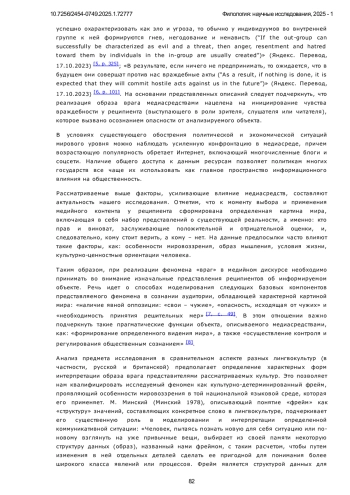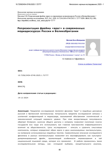 МАСЛОВА О. В. РЕПРЕЗЕНТАЦИЯ ФРЕЙМА «ВРАГ» В СОВРЕМЕННЫХ МЕДИАДИСКУРСАХ РОССИИ И ВЕЛИКОБРИТАНИИ // ФИЛОЛОГИЯ: НАУЧНЫЕ ИССЛЕДОВАНИЯ. 2025. № 1