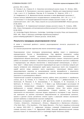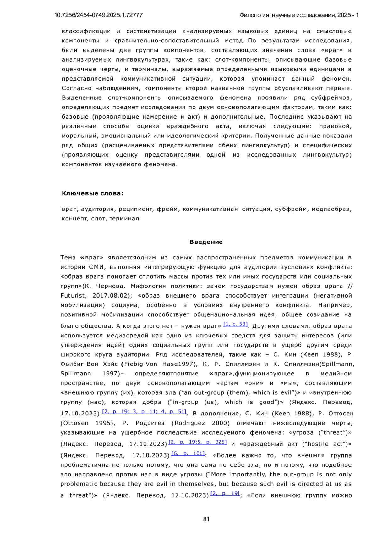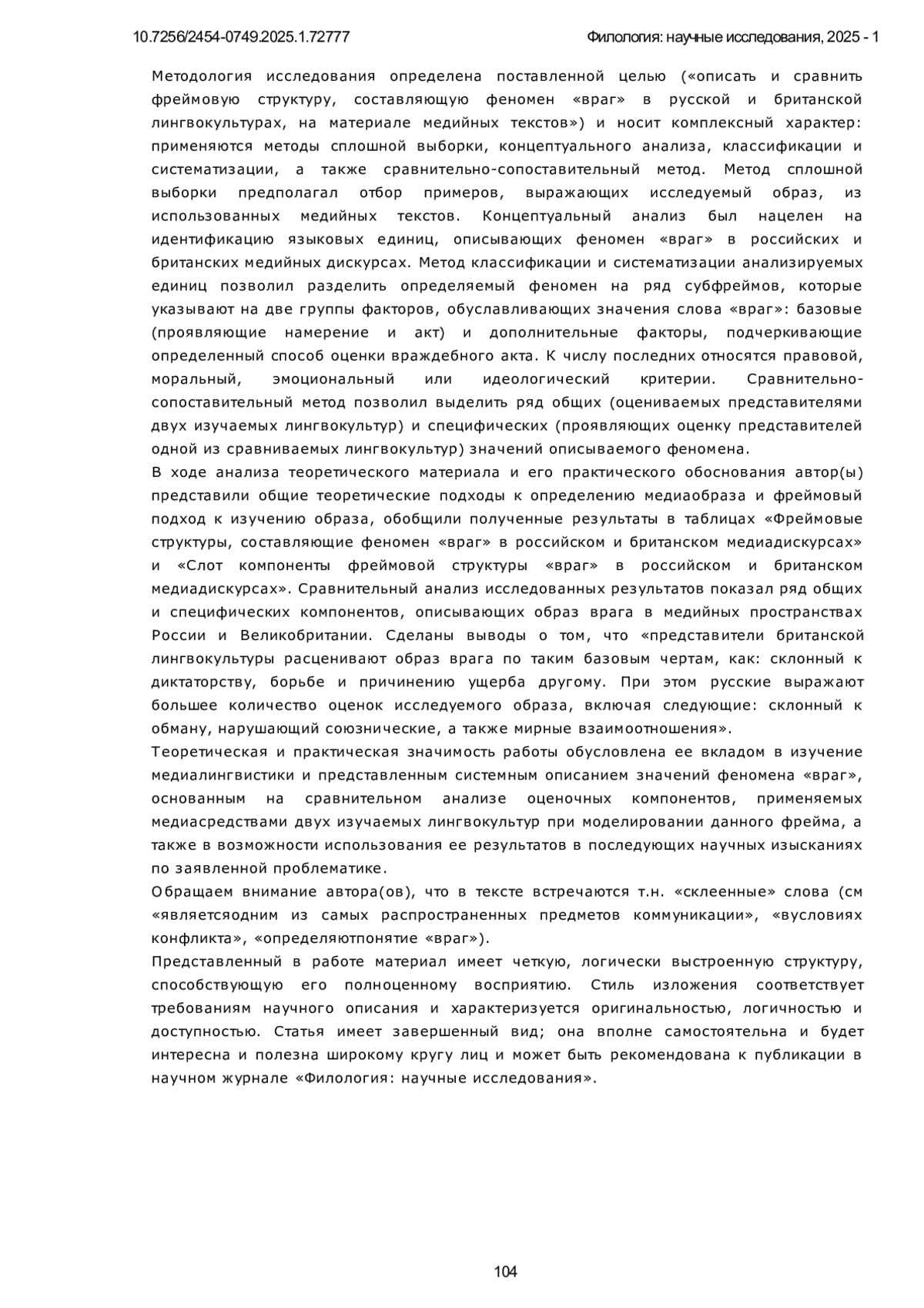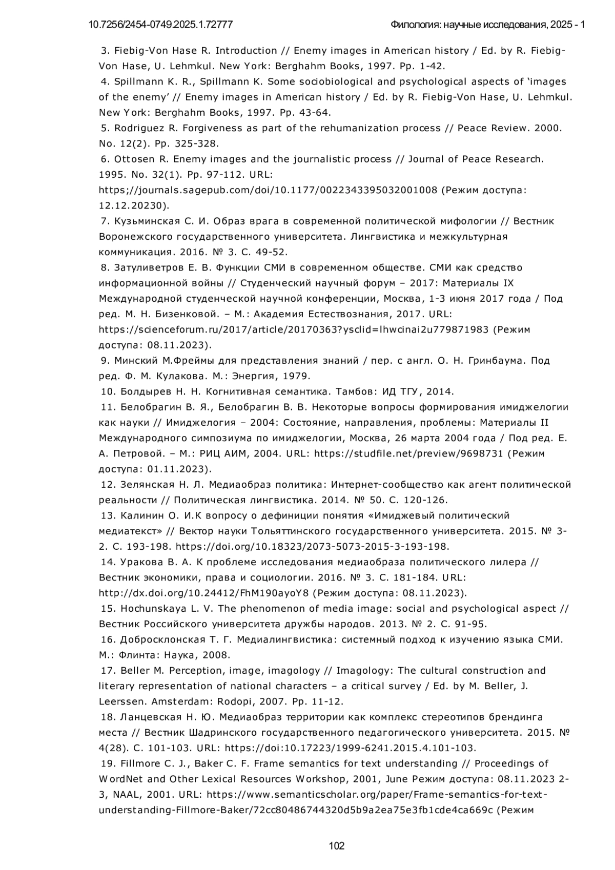 МАСЛОВА О. В. РЕПРЕЗЕНТАЦИЯ ФРЕЙМА «ВРАГ» В СОВРЕМЕННЫХ МЕДИАДИСКУРСАХ РОССИИ И ВЕЛИКОБРИТАНИИ // ФИЛОЛОГИЯ: НАУЧНЫЕ ИССЛЕДОВАНИЯ. 2025. № 1