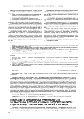 Целью данного исследования является разработка технологии формирования лексической компетенции у студентов языковых факультетов с использованием платформы и приложения TED TALKS в качестве эффективного инновационного инструмента. Глобальные образовательные тенденции современного постмодернистского общества бросают вызов традиционным ценностям и определяют главенствующую и самостоятельную роль обучающегося в процессе освоения знаний, навыков и умений в ходе обучения разноплановым дисциплинам, что затрагивает в том числе и образование в сфере иностранных языков. Привычная передача знаний «от учителя к ученику» заменяется на автономность в обучении, самообразование и саморазвитие в процессе реализации персонализированных задач при движении по индивидуальному образовательному маршруту в рамках личностно ориентированного подхода. Цифровые технологии в свете глобальной модернизации, информатизации и цифровизации российского образования формируют абсолютно новое образовательное пространство, в котором всеобъемлюще реализуется образовательный потенциал внедрения инноваций в сферу обучения иностранным языкам, что определяет актуальность поиска новых методов и форм, создания методологически обоснованных технологий обучения иностранным языкам на базе онлайн-контента, изучение которого представляется возможным только при условии адекватного уровня сформированности лексической компетенции каждого обучающегося, что определяет главенствующую роль обучения лексике как важнейшему компоненту всех видов речевой деятельности. В рамках данного исследования была разработана и апробирована технология формирования лексической компетенции у студентов языковых факультетов с использованием уже зарекомендовавшей себя в образовании и самообразовании платформы TED TALKS (включая мобильное приложение), которая предоставляет пользователям увлекательный и полезный контент для освоения и совершенствования языковых и речевых навыков и умений, формирования различных компетенций в составе иноязычной коммуникативной компетенции.