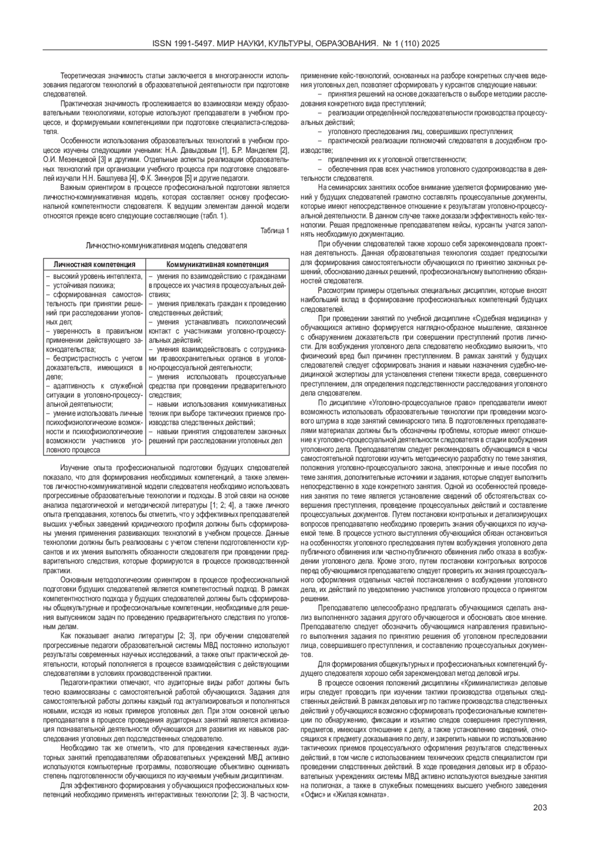 Актуальность статьи заключается в необходимости использования педагогами различных методов обучения, позволяющих сформировать у обучающихся общекультурные и профессиональные компетенции и подготовить высокопрофессиональных следователей для их деятельности в следственных подразделениях.