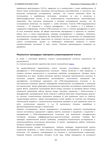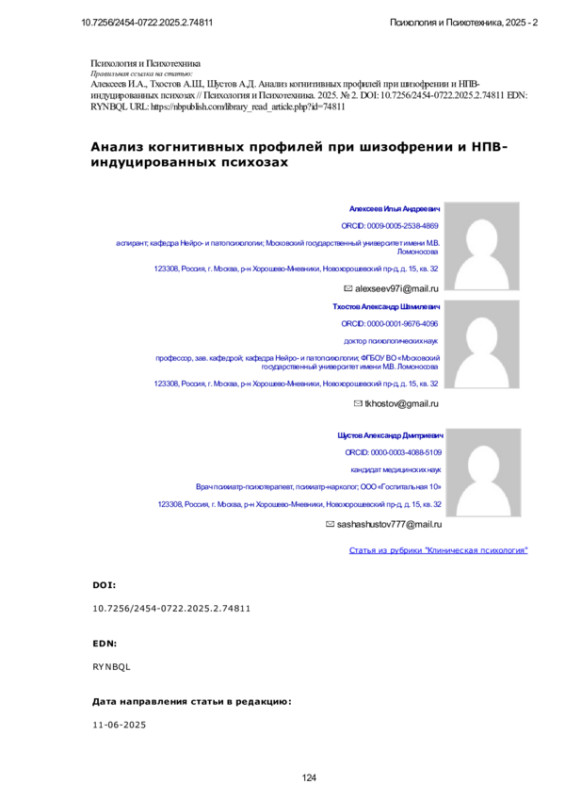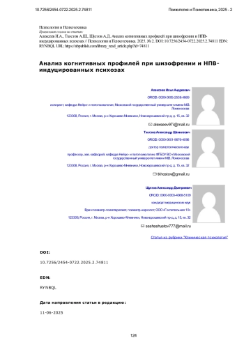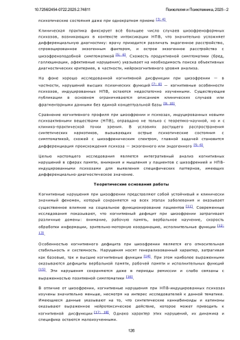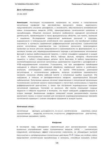 Настоящее исследование направлено на анализ и сопоставление когнитивных профилей при расстройствах различного генеза: эндогенного, представленного случаями шизофрении, и экзогенного, обусловленного употреблением новых психоактивных веществ (НПВ), преимущественно синтетических катинонов и каннабиноидов. Объектом изучения являются особенности нарушений когнитивной деятельности, проявляющиеся в таких функциональных областях, как память, внимание и мышление. Исследование предполагает выявление различий в структуре, выраженности и потенциальной устойчивости этих нарушений, что приобретает особую значимость в контексте современной дифференциальной диагностики. Сравнительный анализ когнитивных характеристик при состояниях различного происхождения позволяет не только уточнить представления о закономерностях их формирования, но и заложить основы для индивидуализированного подхода к восстановлению когнитивных функций в рамках реабилитационной терапии, с учётом специфики нарушений в каждой из групп. Использовались шкала BACS, таблицы Шульте, методика «Исключение лишнего» и субтест «Недостающие детали» теста Векслера. В работе представлены систематизированные различия когнитивных характеристик пациентов с шизофренией и НПВ-индуцированными психозами. Установлено, что при шизофрении преобладают нарушения в области семантической обработки, вербальной памяти и устойчивого внимания, отличающиеся стабильностью. В группе НПВ-психозов доминируют регуляторные и исполнительные дефициты, включая ослабление произвольного контроля, снижение объёма рабочей памяти и ситуативные ошибки мышления. Эти нарушения, в отличие от шизофренического профиля, характеризуются большей лабильностью. Полученные данные уточняют представления о когнитивной организации психотических состояний разного происхождения и могут быть использованы в практике дифференциальной диагностики, а также при построении индивидуальных программ когнитивной коррекции. Несмотря на различия, обе группы показывают сходные трудности в гибкости мышления и внимании, что может затруднять дифференциацию в остром периоде. Выявленные профили позволяют точнее разграничивать психозы различного генеза и служат основой для построения индивидуализированных программ когнитивной коррекции с учётом специфики нарушений в каждой группе.