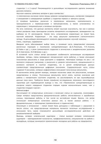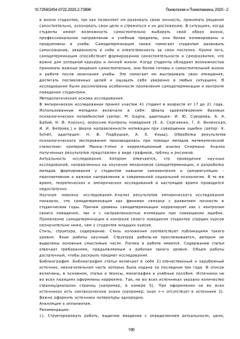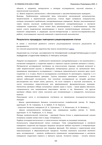 Предметом данного исследования являются особенности проявления самодетерминации и ее взаимосвязи с контролем поведения у студентов первого и третьего курсов. Авторы подробно рассматривают теоретические основы самодетерминации в рамках теории Деси и Райана, включая базовые психологические потребности (автономия, компетентность, принадлежность). Особое внимание уделяется сравнительному анализу показателей самодетерминации и поведенческого контроля у студентов разных курсов. Авторы исследуют, как изменяются эти показатели в процессе обучения, и выявляют статистически значимые различия между группами. Показано, что студенты первого курса демонстрируют более высокий уровень автономии и волевого контроля, в то время как у третьекурсников наблюдается повышенная тревожность при совершении ошибок. Особый акцент делается на выявленных корреляциях между автономией и эмоциональным контролем, а также между тревожностью и чувством принадлежности. Эти результаты имеют важное значение для понимания психологических механизмов адаптации студентов к учебному процессу. Выборку исследования составили 41 студент в возрасте от 17 до 21 года. Психологические методики: Шкала удовлетворения базовых психологических потребностей (M. Gagne), опросник Контроль поведения (Е. А. Сергиенко и др.) и Шкала направленности мотивации при совершении ошибки (K. Schell). Методы математической статистики: критерий Манна-Уитни и корреляционный анализ Спирмана. Новизна исследования заключается в комплексном изучении связи между уровнем самодетерминации, контролем поведения и отношением к совершаемым ошибкам у студентов первого и третьего курсов. Впервые выявлены различия в проявлении автономии, компетентности и принадлежности у первокурсников и третьекурсников, а также установлены их корреляции с эмоциональным и волевым контролем. Основными выводами проведенного исследования являются: у студентов первого курса показатели автономии и волевого контроля выше, чем у третьекурсников, что может быть связано с адаптацией к учебной среде; уровень самодетерминации коррелирует с эмоциональным контролем и мотивацией при совершении ошибок, но не зависит от возраста студентов; выявлена обратная связь между автономией и тревожностью по поводу ошибок, что подчеркивает важность развития самодетерминации для снижения стресса. Результаты исследования могут быть использованы для разработки стратегий поддержки студентов в процессе обучения.