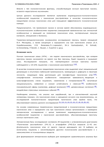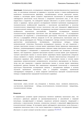 Актуальность исследования определяется распространенностью панических атак, их негативным влиянием на здоровье и качество жизни, а также необходимостью выявления психологических факторов, способствующих ночным приступам паники, которые в настоящее время остаются недостаточно изученными. В последнее время наблюдается увеличение числа больных с синдромом панических атак, в том числе подростков и студентов, что затрудняет процесс обучения и в целом снижает качество жизни и здоровья. Целью данного исследования является выявление индивидуально-психологических особенностей пациентов с паническим расстройством в качестве психологических предикторов ночных панических атак для повышения эффективности психологической помощи. Объектом исследования выступает клиничко-психологические особенности панического расстройства. Предметом исследования являются психологические предикторы панических атак при нарушениях сна. В исследовании участвовали 29 пациентов с установленными диагнозами «Паническое расстройство» (F41.0) и агарофобия (F40.0) в возрасте 21-43 лет. Длительность панических атак от одного года до двенадцати лет. Методы исследования: методы клинико-психологической диагностики (анкетирование, тестирование, проективные методы), методы математической статистики. Результаты исследования показали, что для пациентов с частыми приступами паники в ночное время характерно более тревожное переживание болезни, сопровождающееся выраженными страхами перед приступами паники, тревоге за свое будущее и отношением к социальному окружению как основному источнику тревоги, чем пациентов с редкими приступами паники в ночное время. Для пациентов с частыми приступами паники в ночное время характерно более выраженное смещение локуса контроля в сторону экстернальности в области межличностных отношений и в отношении здоровья. Для пациентов с частыми приступами паники в ночное время характерна интрапсихическая направленность личностного реагирования на болезнь, тогда как для пациентов с редкими приступами паники в ночное время характерна внутренняя картина болезни без выраженных нарушений психической и социальной адаптации. Перспективы исследования связаны с расширением выборки в аспекте изучения проявления панических атак у учащейся молодежи, проявлений совладающего поведения, а также создания комплексных программ психологической помощи и профилактики нарушений психического здоровья.