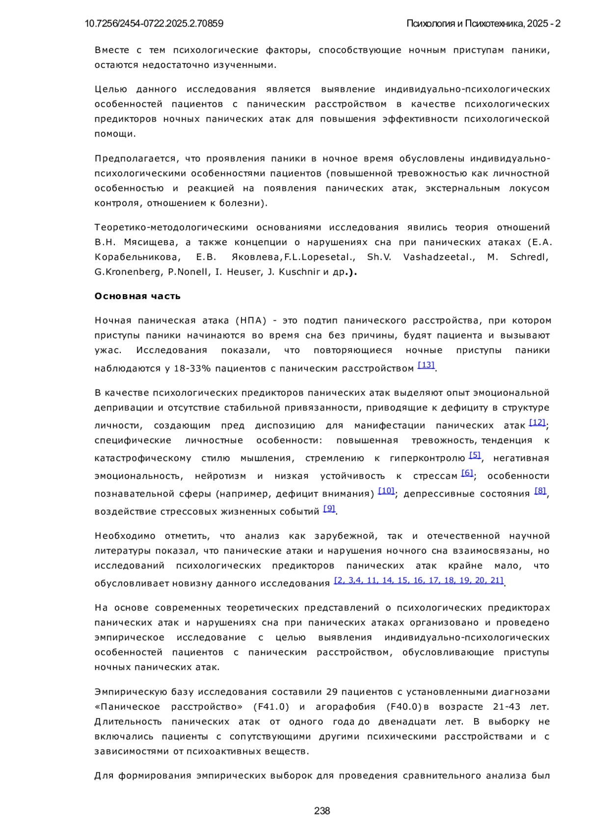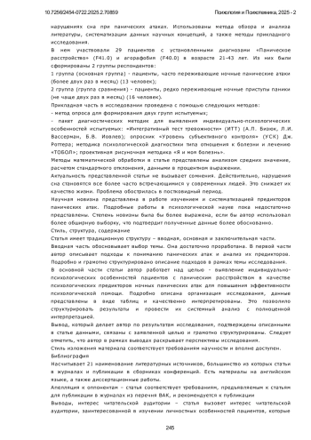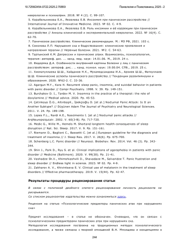 6. Корабельникова Е.А., Яковлева Е.В. Роль инсомнии и её коррекции при паническом расстройстве // Анналы клинической и экспериментальной неврологии. 2022. № 16(4). С. 62-70.
