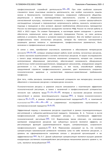 22. Семенова Н. А. Метаресурс жизненной успешности как психологический предиктор профессиональной успешности сотрудников органов внутренних дел // Психопедагогика в правоохранительных органах. 2024. Т. 29. № 1(96). С. 89-101. DOI: 10.24412/1999-6241-2024-196-000-000