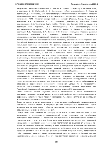 Актуальность исследования метаресурса жизненной успешности и его взаимосвязи с ресурсами конструктивной жизни у сотрудников органов внутренних дел обусловлена рядом взаимообусловливающих факторов: необходимостью выявления и исследования таких личностных ресурсов, которые бы помогали современному человеку осуществлять конструктивную жизнь в современных условиях, перспективностью развития ресурсного подхода в психологии труда; необходимостью изучения ресурсных возможностей личности сотрудников органов внутренних дел в условиях современной реальности в связи с повышающимися требованиями к их профессиональной служебной деятельности. В статье представлено понимание и структурно-функциональная организация метаресурса жизненной успешности личности, обоснована его акцепторная функция. Уделено внимание системе личностных ресурсов, представлена точка зрения на организацию ресурсов конструктивной жизни личности. В исследовании приняло участие 892 сотрудника органов внутренних дел Российской Федерации, из них 388 женщин и 504 мужчины. Диагностические методики направлены на измерение таких ресурсов конструктивной жизни личности, как: мотивационные и психологические состояния; интегративные личностные характеристики, способствующие эффективному и успешному преодолению жизненных трудностей; характеристики субъектности. Основные результаты проведенного исследования свидетельствуют о том, что метаресурс жизненной успешности, как сложное многокомпонентное интегративное образование, имеет устойчивые взаимосвязи со многими показателями личностных ресурсов конструктивной жизни в исследуемой выборке сотрудников органов внутренних дел Российской Федерации. В результате проведения корреляционного анализа установлено большое количество значимых взаимосвязей компонентов метаресурса жизненной успешности с показателями личностных ресурсов конструктивной жизни. При этом компонент эмоциональные переживания (в частности, нравственные и бытийные переживания) имеет наименьшее количество значимых корреляций с показателями ресурсов конструктивной жизни. Метаресурс жизненной успешности, как сложное многокомпонентное интегративное образование, имеет устойчивые взаимосвязи со многими показателями личностных ресурсов конструктивной жизни в исследуемой выборке сотрудников органов внутренних дел Российской Федерации. Это позволяет сделать предположение о наличии в системе ресурсов респондентов определенных «ядерных» связей, которые участвуют в организации конструктивной жизни. Новизна и значимость полученных в представленном исследовании результатов заключается в том, что предложено понимание метаресурса жизненной успешности, основной функцией которого является акцепторная.