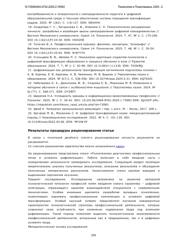 17. Селюч М. Г., Лейфа А. В., Никитина А. А. Особенности профессиональной востребованности и толерантности к неопределенности педагога в цифровой образовательной среде // Научное обеспечение системы повышения квалификации кадров. 2025. № 1(62). С. 116-127.