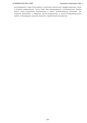 Современные профессиональные реалии, в которых нейросети генерируют код, а VR-терапевты корректируют психические состояния, ставят под сомнение адекватность традиционных классификаций профессий. В данном контексте предметом исследования выступает разработка психотехник диагностики профессиональных психотипов, учитывающих цифровизацию всех сфер труда. Основная научная задача заключается в модернизации авторской психологической типологии профессий путем введения параметра цифровой интеграции и создания соответствующих диагностических инструментов. Исходим из предположения, что такой подход не только сохранит базовые принципы классификации, но и позволит отразить новые гибридные формы профессиональной деятельности, возникающие на стыке цифровых и традиционных компетенций, что в конечном итоге обеспечит релевантную оценку профессиональных характеристик в условиях современной цифровой среды. Методология исследования органично сочетает классические подходы психологии труда с современными цифровыми концепциями. Междисциплинарный синтез объединил достижения когнитивной психологии, нейронауки, антропологии цифрового труда. Последовательно реализован методологический принцип исследования - диалектическое сочетание преемственности и изменчивости в эволюции профессиональных психотипов. Сохранена базовая структура авторской психологической типологии (21 психотип) с добавлением цифрового параметра. Научная новизна заключается в создании и валидизации авторских диагностических инструментов - модифицированного опросника профессиональной направленности и новой методики оценки цифровой вовлеченности. Проведенная на репрезентативной выборке (903 респондента) психометрическая проверка, включавшая конфирматорный факторный анализ, подтвердила высокую надежность и валидность методик. Особым вкладом стало обоснование параметра цифровой интеграции, который позволил выявить различные типы профессиональной адаптации к цифровой среде и зафиксировать новые гибридные формы профессиональной деятельности (аудиторы этики ИИ, медиаторы киберконфликтов), сохраняющие ядро традиционных метатипов при обновлении содержания деятельности. Сохраняя связь с традиционными профессиональными типами, они демонстрируют новое содержание деятельности, отражающее современные требования цифровой экономики. Практическая значимость исследования проявляется в создании эффективного диагностического инструментария, позволяющего оценивать уровень цифровой готовности специалистов, прогнозировать возможные кризисы профессиональной идентичности и разрабатывать персонализированные программы развития. Применение разработанных методик в организационной практике открывает новые возможности для кадровой работы, включая оценку цифровых компетенций, проектирование индивидуальных траекторий профессионального роста, оптимизацию процессов подбора персонала и профилактику профессиональной дезадаптации в условиях цифровой трансформации