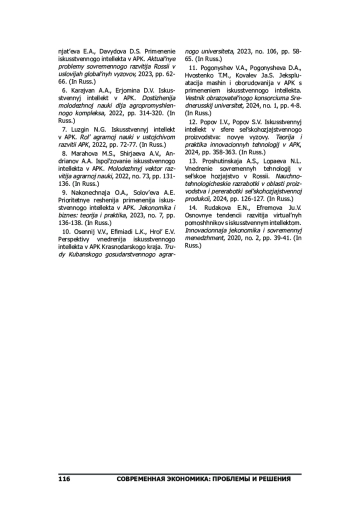 5. Ивашова О.Н., Яшкова Е.А., Чернятьева Е.А., Давыдова Д.С. Применение искусственного интеллекта в АПК // Актуальные проблемы современного развития России в условиях глобальных вызовов, 2023, с. 62-66. EDN: XUHUKS