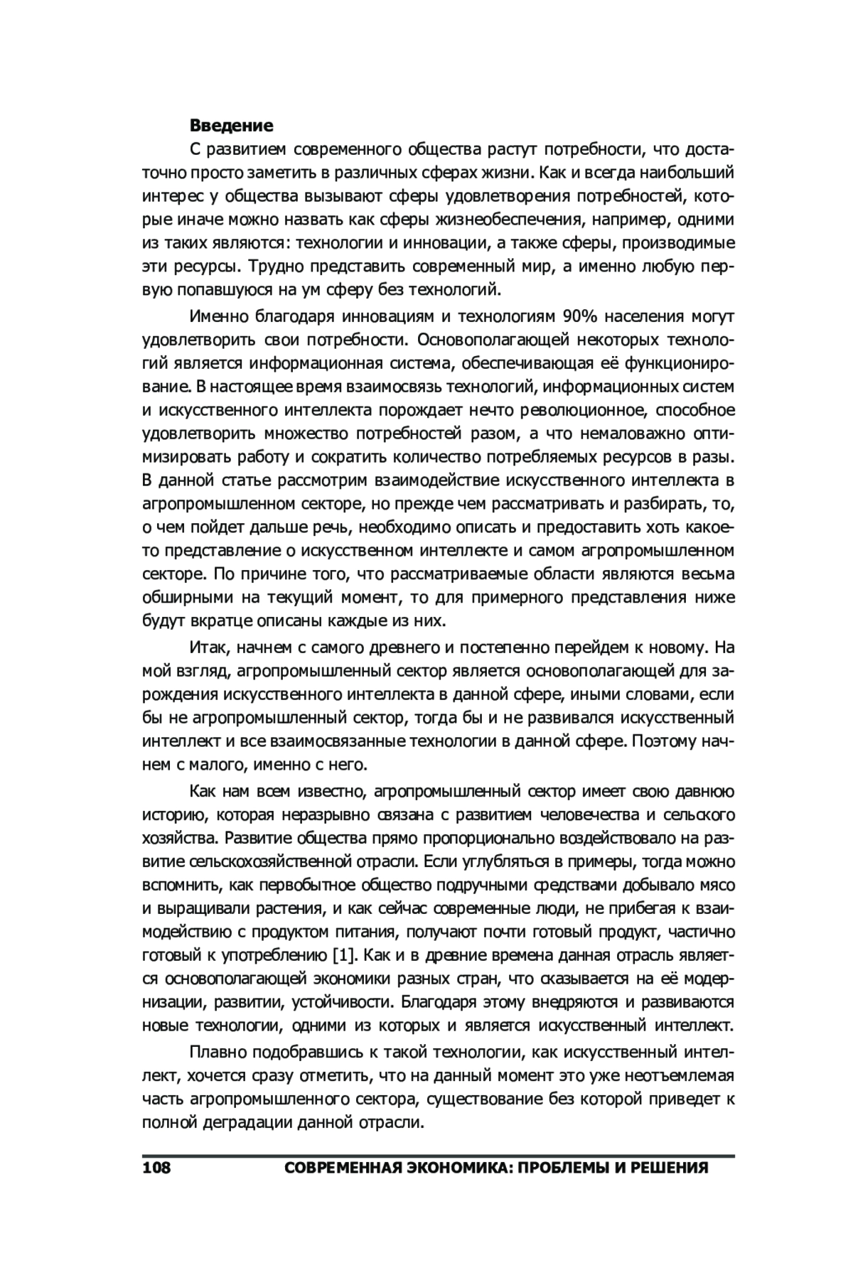 Именно благодаря инновациям и технологиям 90% населения могут удовлетворить свои потребности. Основополагающей некоторых технологий является информационная система, обеспечивающая её функционирование. В настоящее время взаимосвязь технологий, информационных систем и искусственного интеллекта порождает нечто революционное, способное удовлетворить множество потребностей разом, а что немаловажно оптимизировать работу и сократить количество потребляемых ресурсов в разы. В данной статье рассмотрим взаимодействие искусственного интеллекта в агропромышленном секторе, но прежде чем рассматривать и разбирать, то, о чем пойдет дальше речь, необходимо описать и предоставить хоть какоето представление о искусственном интеллекте и самом агропромышленном секторе. По причине того, что рассматриваемые области являются весьма обширными на текущий момент, то для примерного представления ниже будут вкратце описаны каждые из них.