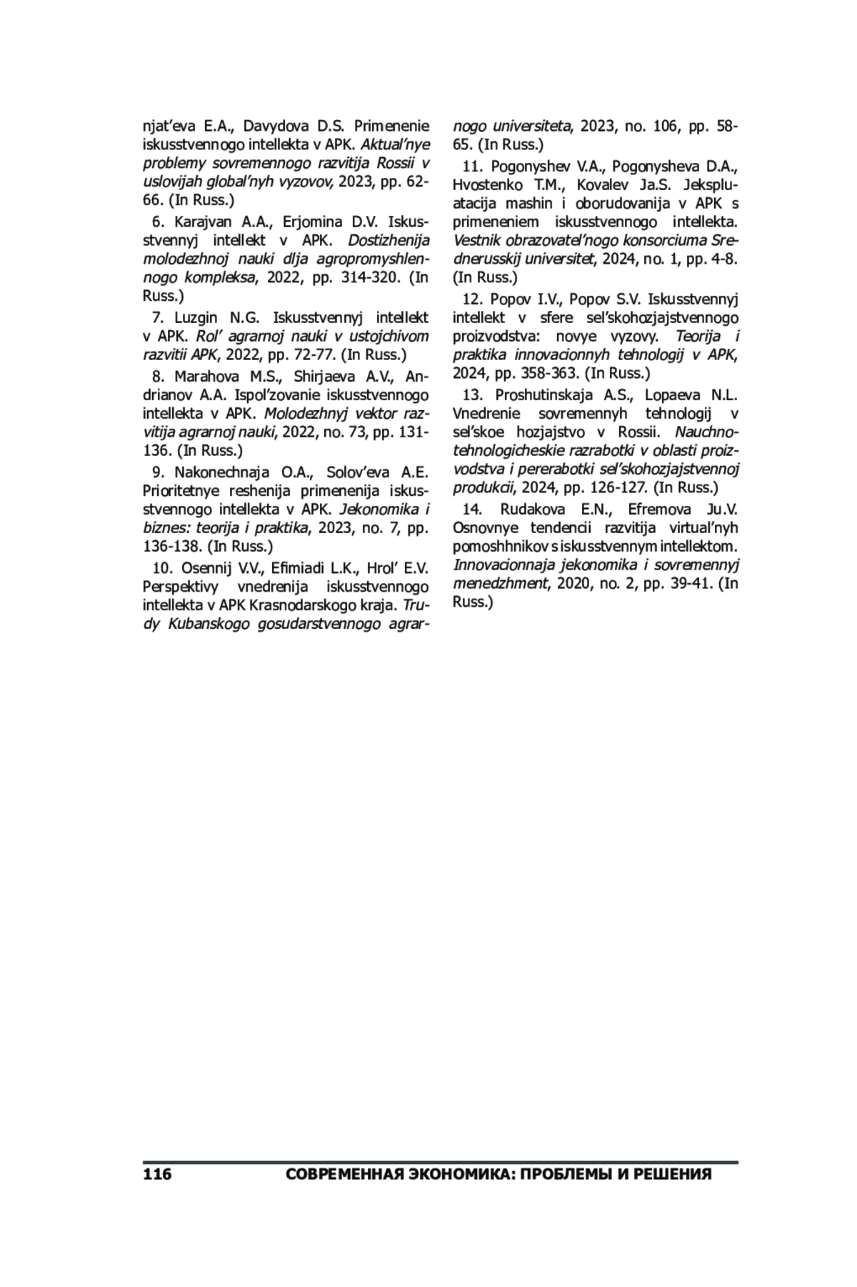 12. Попов И.В., Попов С.В. Искусственный интеллект в сфере сельскохозяйственного производства: новые вызовы // Теория и практика инновационных технологий в АПК, 2024, с. 358-363. EDN: KFJTAX