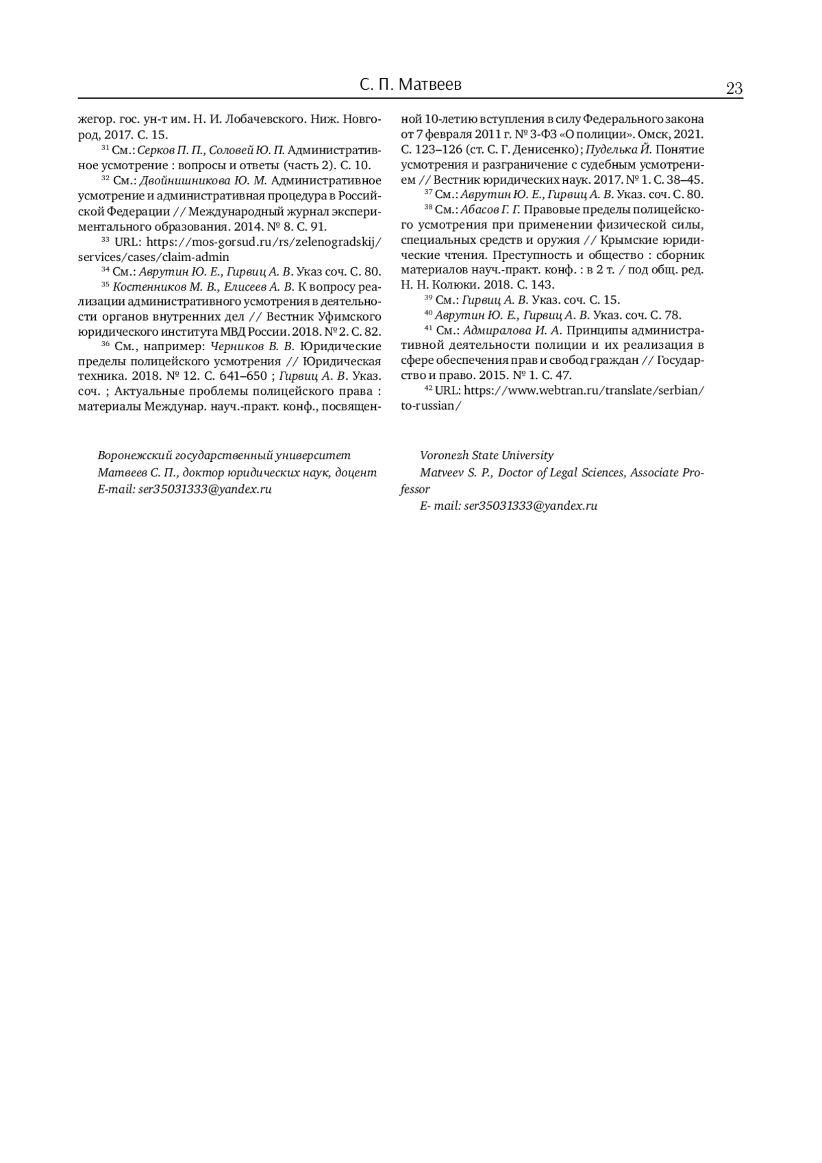 35. Актуальные проблемы полицейского права: материалы Междунар. науч.-практ. конф., посвященной 10-летию вступления в силу Федерального закона от 7 февраля 2011 г. № 3-ФЗ “О полиции”. Омск, 2021. С. 123-126 (ст. С. Г. Денисенко.