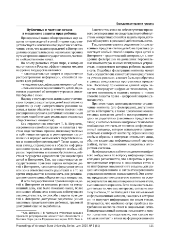 В статье рассматриваются особенности защиты прав детей в условиях развития информационного общества, характеризующегося ускоренным темпом изменения условий существования человек, с учетом необходимости сохранения и поддержания «принципа наилучшего обеспечения интересов ребенка». Используя общие и специальные научные методы, в том числе метод сравнительного анализа, метод количественной оценки и метод формальной логики, автор систематизирует угрозы в Интернете, существующие в отношении детей, исследует границы правовой категории «дети» применительно к вопросу защиты их прав в Интернете, а также пытается определить соотношение публичного, частного и общественного начал в общем механизме защиты прав ребенка в интернет-пространстве.