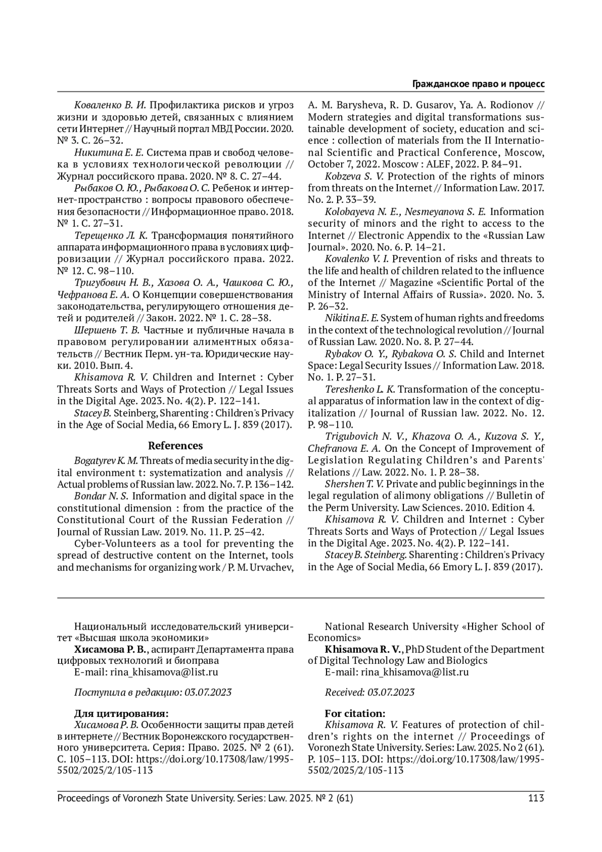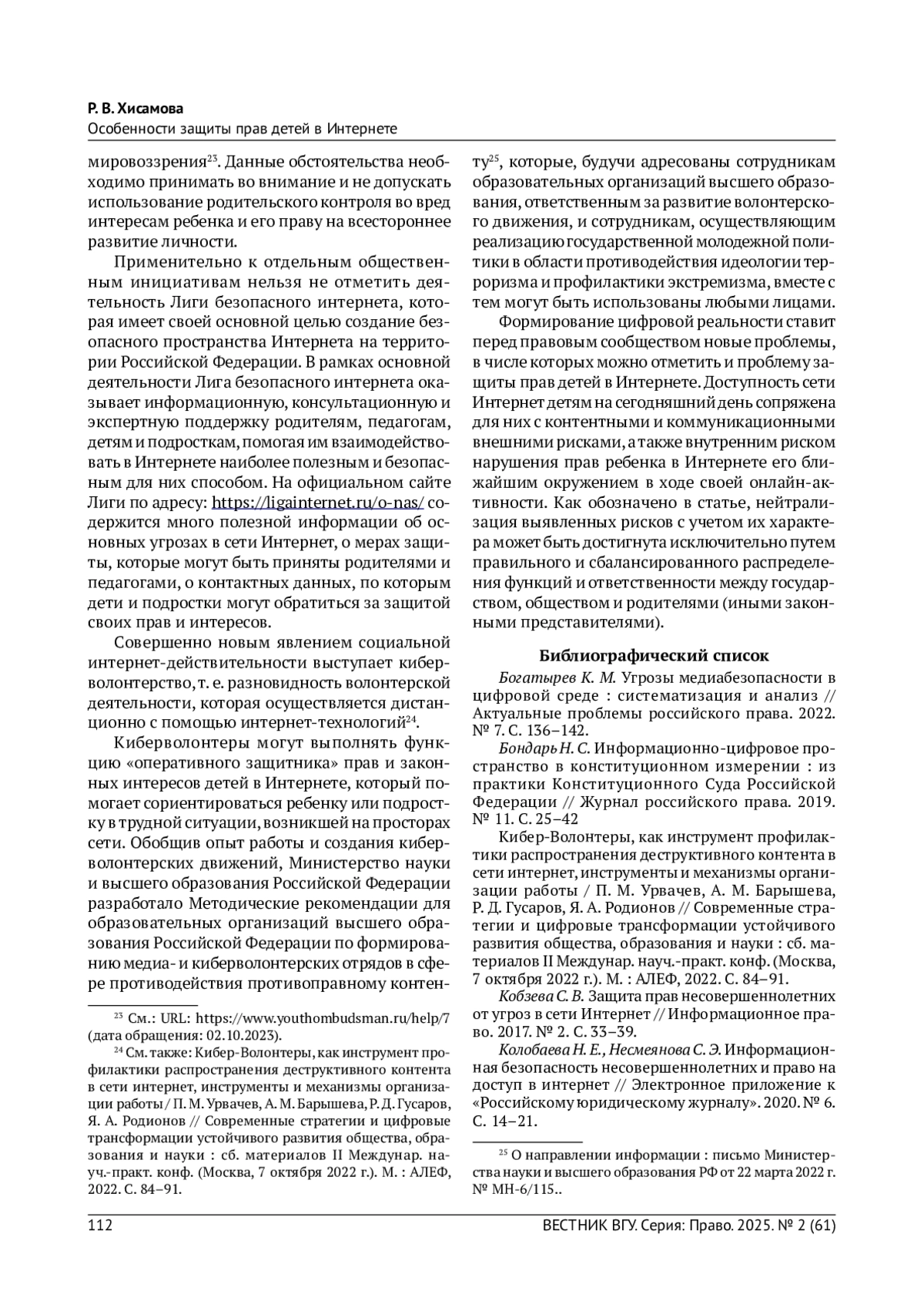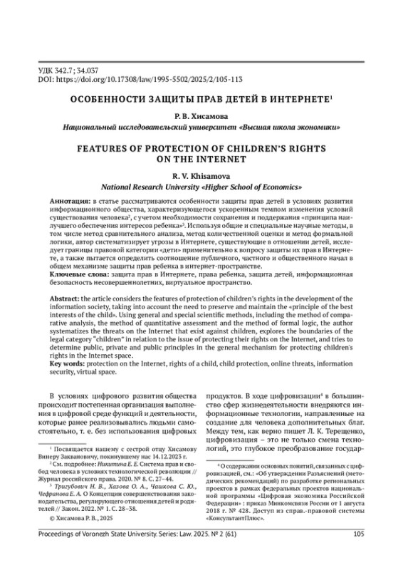 ХИСАМОВА Р. В. ОСОБЕННОСТИ ЗАЩИТЫ ПРАВ ДЕТЕЙ В ИНТЕРНЕТЕ // ЯЗЫК, КОММУНИКАЦИЯ И СОЦИАЛЬНАЯ СРЕДА. 2025. № 23