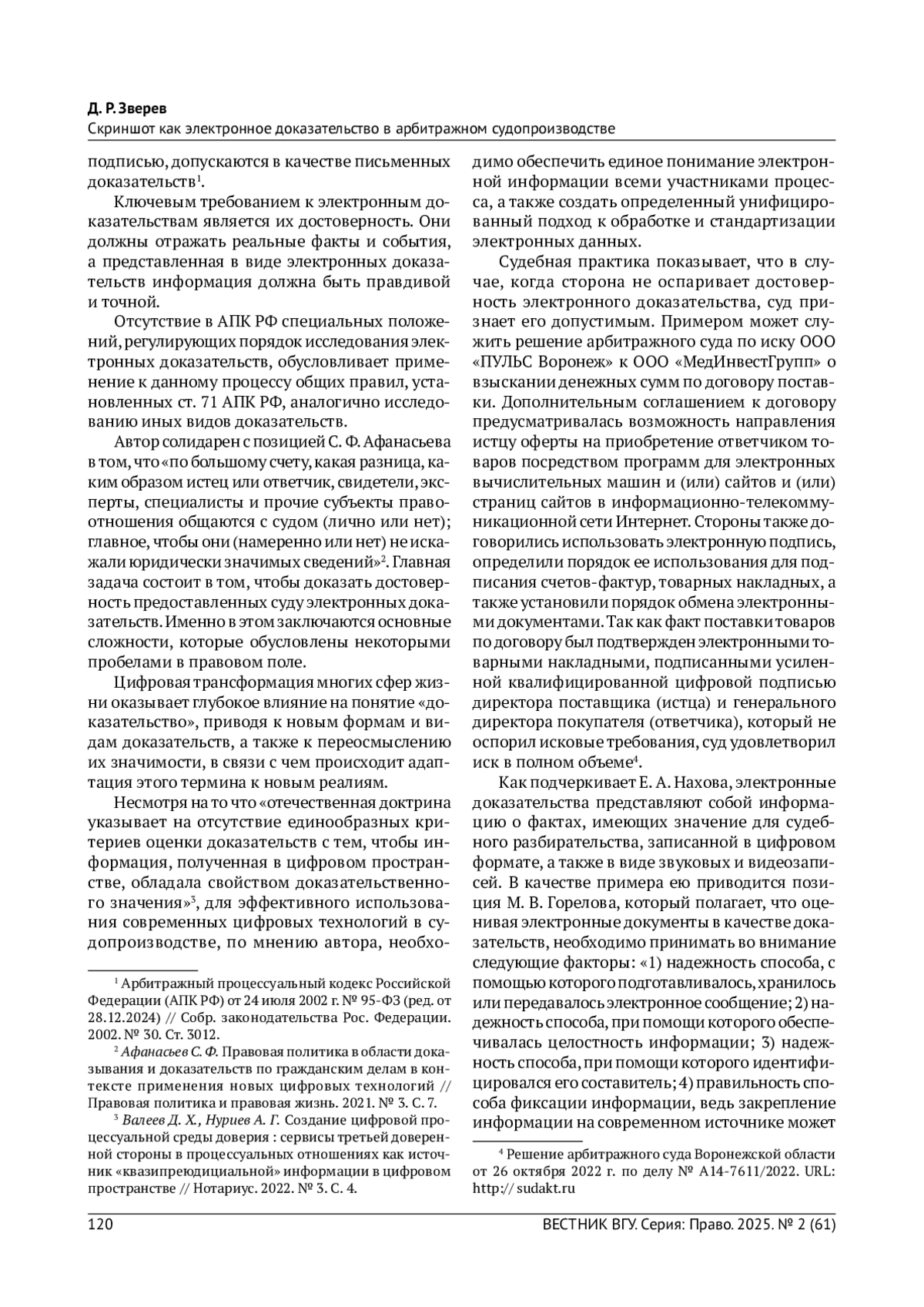 2. Афанасьев С. Ф. Правовая политика в области доказывания и доказательств по гражданским делам в контексте применения новых цифровых технологий // Правовая политика и правовая жизнь.2021. № 3. EDN: ZZBRTO