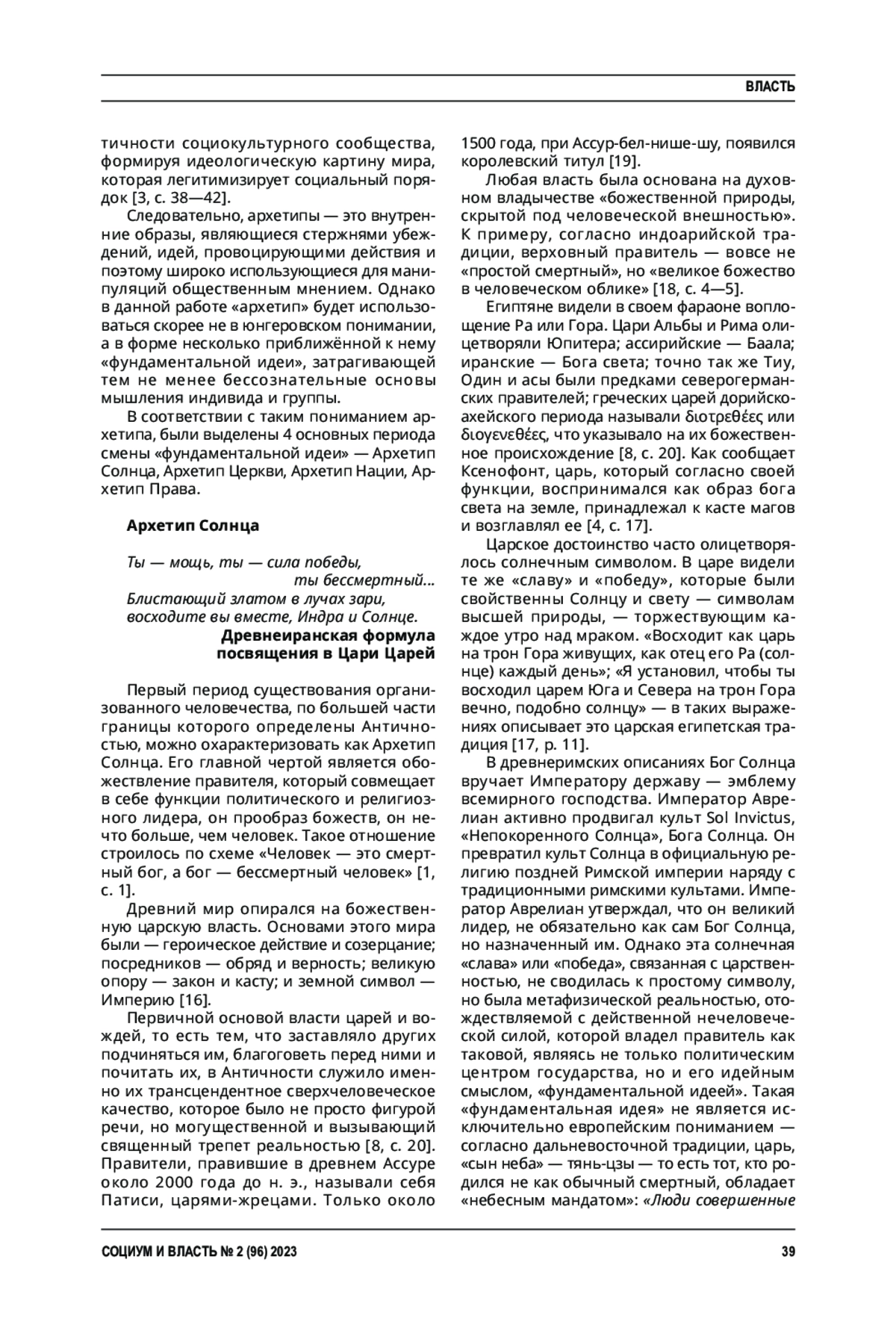 Данная статья несёт в себе авторское понимание феноменов, являющихся основой идеологической картины мира разных категорий социальных групп. Автором представлена историческая поэтапность развития основополагающих идей, являющихся сутью социальной идентичности и, следовательно, влияющих на легитимацию власти на протяжении организованной истории человечества и в современности. Такое понимание архетипов в политических науках представлено впервые. Статья выстроена вокруг понятия «архетип» и расширяет его значение до политических и идеологических измерений. Так, с помощью методологии категорий архетипов были выявлены следующие формы, превалирующие в организованной истории человечества: архетипы Солнца, Церкви, Нации и Права. Такие формы могут являться удобной методологией в конфликтологии, политологии, в науке о международных отношениях. Представленный подход открывает новое теоретическое направление в указанных науках.