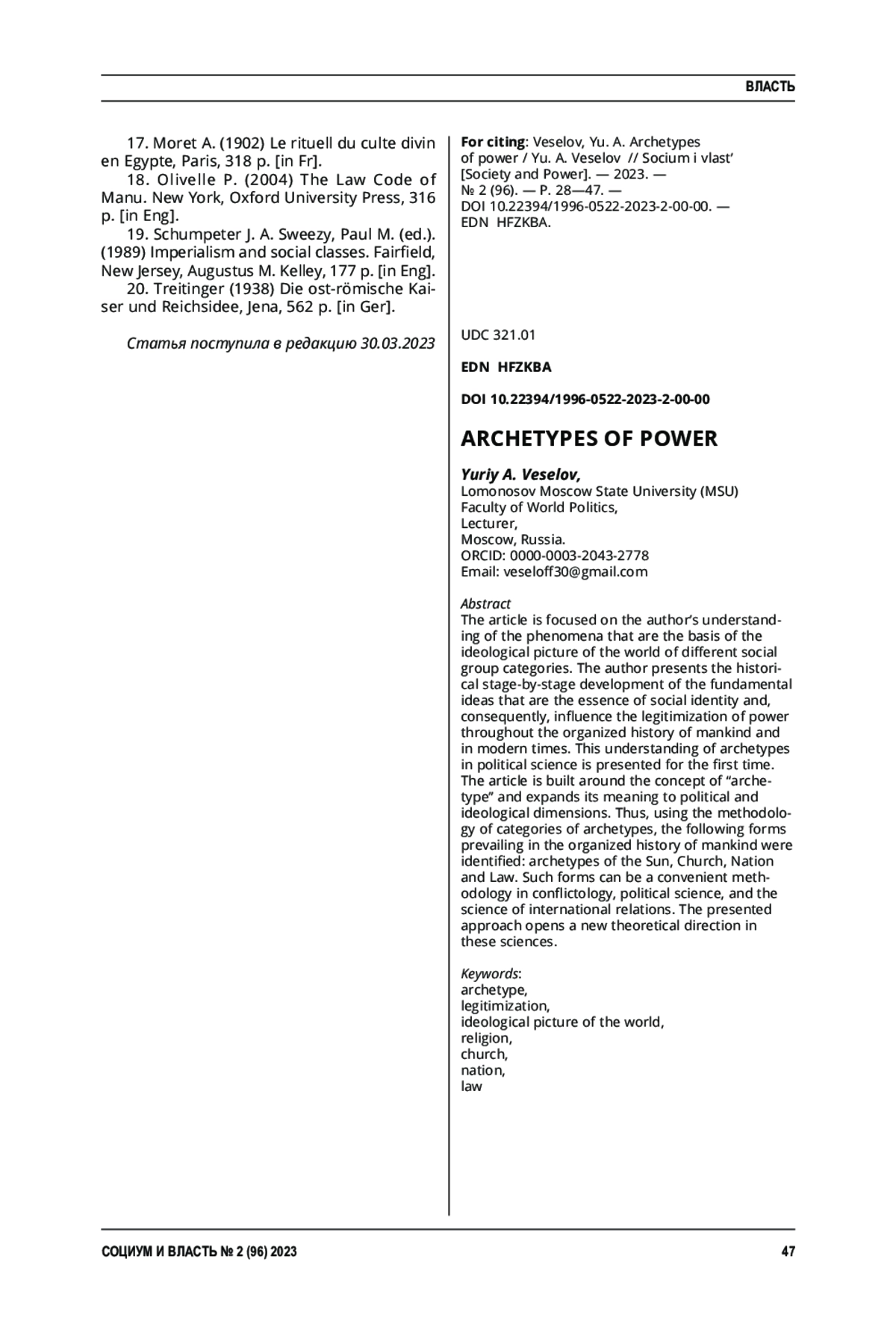 2. Грицков, Ю. В. Архетипические составляющие легитимности власти / Ю. В. Грицков, Д. В. Львов // Социум и власть. - 2017. - № 1 (63). - С. 38-42. EDN: YKROHH