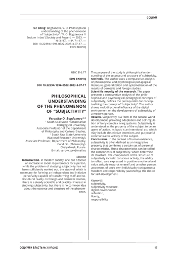 Методы. В исследовании применяется сравнительный анализ философской и психолого-педагогической литературы, обобщение и систематизация результатов отечественных и зарубежных исследований. Новизна исследования. В работе проведен сравнительный анализ философских и психолого-педагогических концепций субъектности, определены предпосылки формирования понятия «субъектность». Показано разнонаправленное влияние цифровой среды на развитие субъектности современного человека.