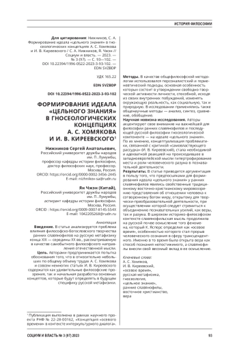 Введение. В статье анализируется проблема влияния философско-богословского творчества ранних славянофилов на русскую метафизику конца XIX - середины XX вв., рассматриваемую в качестве самобытного философского направления отечественной мысли. Цель. Авторами предпринимается попытка обоснования того, что в относительно небольших по общему объему трудах А. С. Хомякова и совсем немногих статьях И. В. Киреевского содержатся как удивительные философские прозрения, так и начальная разработка основных концептов, которые будут определять в будущем специфику русской метафизики. Методы. В качестве общефилософской методологии использовался персоналистский и герменевтический подходы, основная особенность которых состоит в утверждении свободно-творческой активности личности, способной, исходя из своих внутренних побуждений, изменять окружающую реальность, как социальную, так и природную. В исследовании применялись также общенаучные методы - анализ, синтез, сравнение, обобщение. Научная новизна исследования. Авторы акцентируют свое внимание на важнейшей для философии ранних славянофилов и последующей русской философии гносеологической компоненте - на идеале «цельного знания». По их мнению, концептуализация проблематики, связанной с критикой «самовластвующего рассудка» (И. В. Киреевский), стала необходимой и адекватной реакцией на происходившее в западноевропейской мысли гипертрофирование места и роли человеческого разума в познавательной деятельности. Результаты. В статье приводится аргументация в пользу того, что предпосылками для формирования идеала «цельного знания» у ранних славянофилов явились свойственные традиционному восточно-христианскому мировоззрению представления об отношении человека к сотворенному Богом миру, открытому для творчески-преобразовательной деятельности, при осуществлении которой следует стремиться к объединению познавательных усилий, как веры, так и разума. В широком историко-философском контексте славянофильская мысль продолжила на русской почве осмысление того феномена, который К. Ясперс определил как «осевое время», особенностью которого стал прорыв человеческого сознания в сферу трансцендентного. Именно в то время была открыта вера как способ познания непостижимого, а славянофилы внесли свой весомый вклад в ее осмысление.