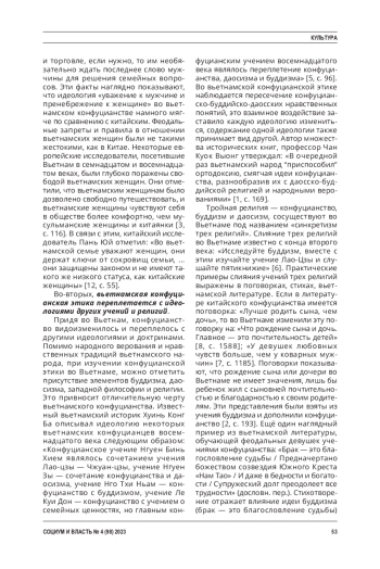 Конфуцианская этика, когда она была принята во Вьетнаме, то потеряла свою первозданность и была адаптирована и дополнена в соответствии с исторической практикой народа, чтобы удовлетворить его потребности и соответствовать изменениям в феодальном обществе Вьетнама. Иными словами, конфуцианская этика была «вьетнамизирована». В статье анализируется процесс внедрения и развития конфуцианской этики во Вьетнаме и определяется ее специфика. По мнению автора, принципы конфуцианской этики были переосмыслены с позиции интересов вьетнамской нации и народа.