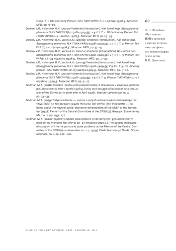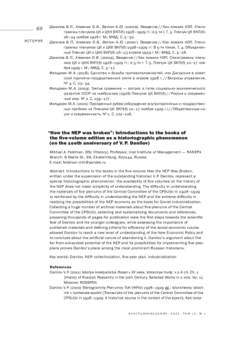 Introductions to the books in the five-volume How the NEP Was Broken, written under the supervision of the outstanding historian V. P. Danilov, represent a special historiographic phenomenon: the availability of five volumes on the history of the NEP does not mean simplicity of understanding. The difficulty in understanding the materials of five plenums of the Central Committee of the CPSU(b) in 1928-1929 is reinforced by the difficulty in understanding the NEP and the extreme difficulty in realizing the possibilities of the NEP economy as the basis for Soviet industrialization. Collecting a huge number of archival materials about five plenums of the Central Committee of the CPSU(b), selecting and systematizing documents and references, preparing thousands of pages for publication were the first steps towards the scientific feat of Danilov and his younger colleagues, while assessing the importance of published materials and defining criteria for efficiency of the social-economic course allowed Danilov to reach a new level of understanding of the New Economic Policy and to conclude about the artificial nature of abandoning it. Danilov’s argument about the far-from-exhausted potential of the NEP and its possibilities for implementing five-year plans proves Danilov’s place among the most prominent Russian historians.