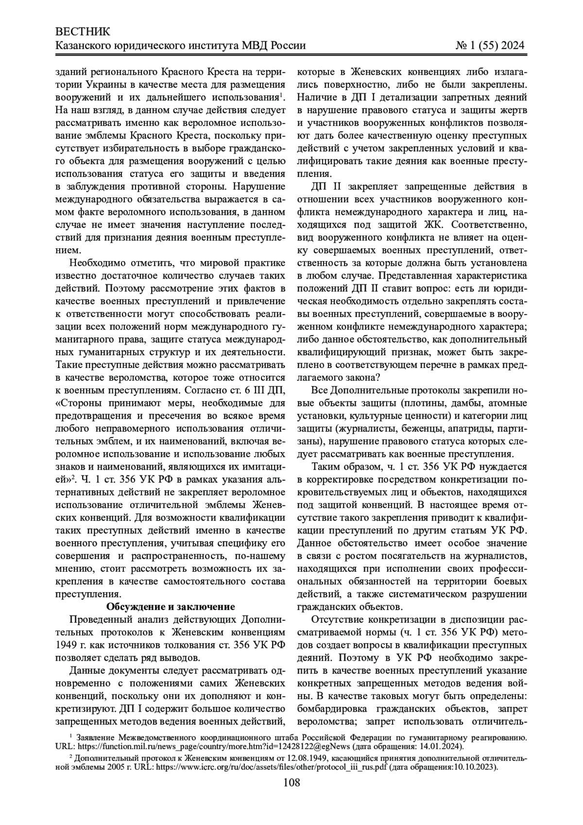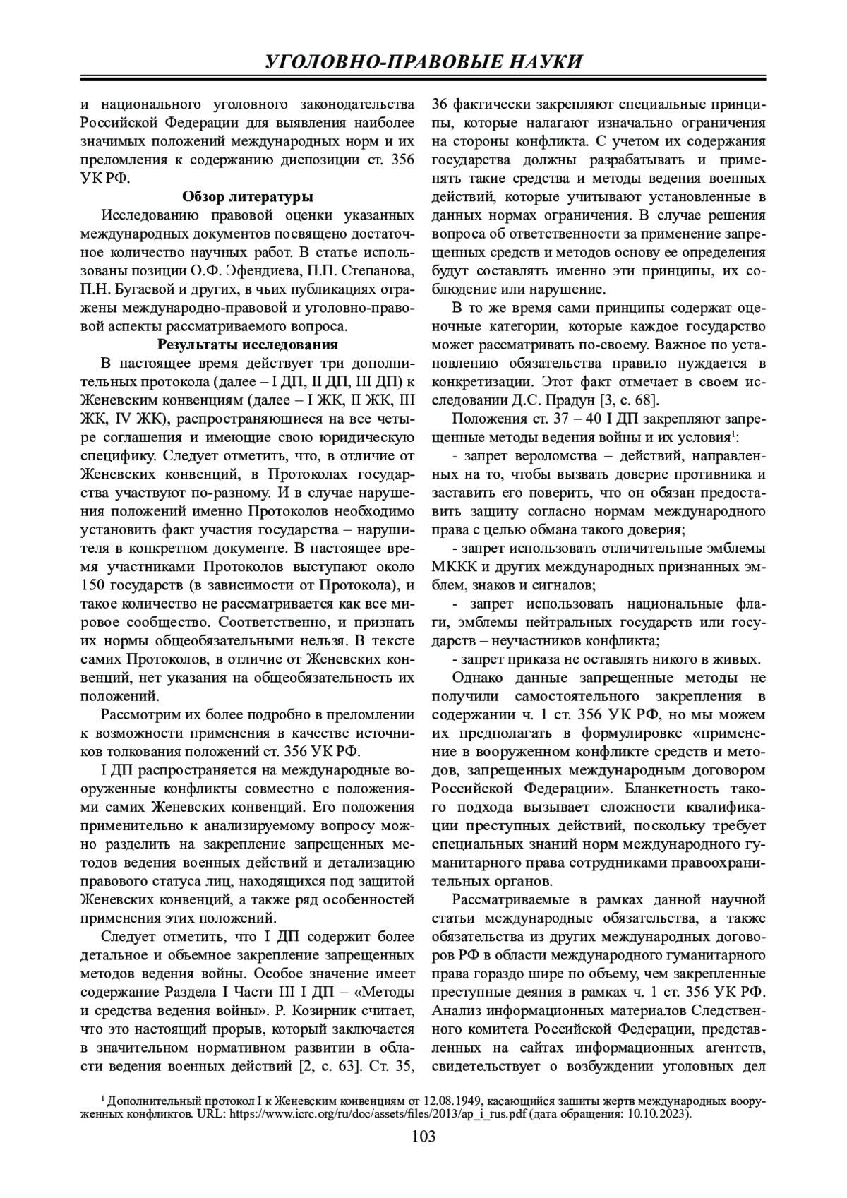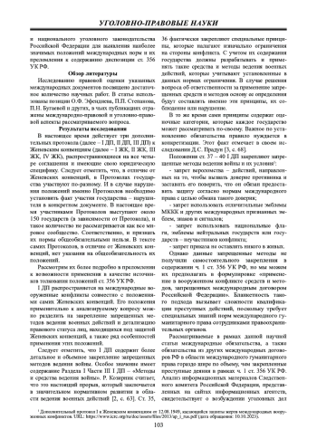 Материалы и методы: материалами послужили Дополнительные протоколы I и II 1977 г. и Дополнительный протокол III 2005 г. к Женевским конвенциям 1949 г. в преломлении к положениям ст. 356 УК РФ. В исследовании применялись методы анализа, сравнения и синтеза для выявления наиболее значимых положений международных норм и их преломления к содержанию диспозиции указанного состава преступления.