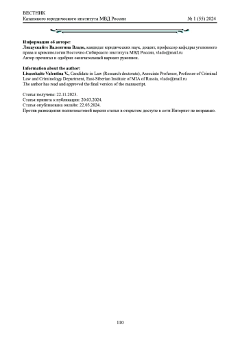Материалы и методы: при написании статьи использовались результаты собственных эмпирических исследований. Применялись общенаучные и частнонаучные методы исследования, которые позволили проанализировать и обобщить собранные авторами относящиеся к предмету исследования материалы из различных источников. Обзор литературы: применялись труды отечественных ученых в области уголовного права, общей теории права, философии и психологии.