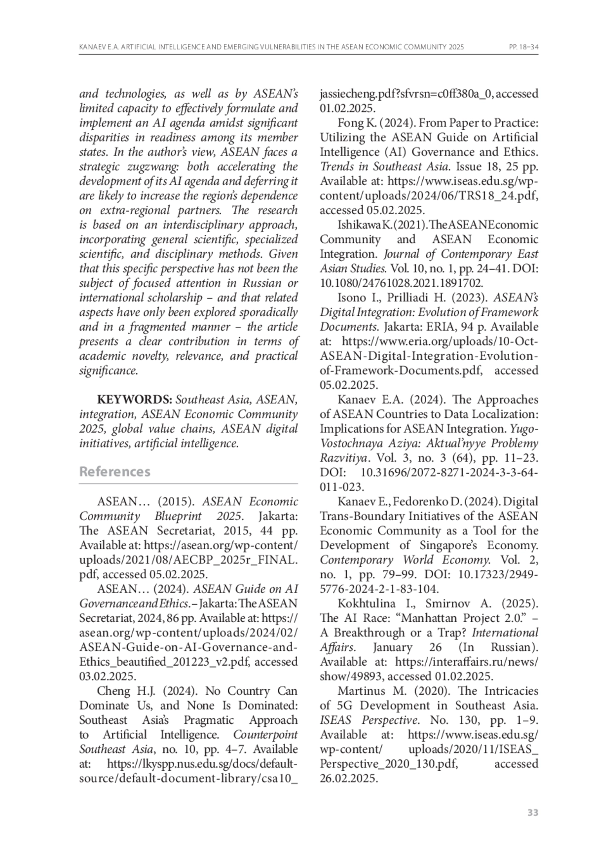 8. Kanaev E.A. The Approaches of ASEAN Countries to Data Localization: Implications for ASEAN Integration // Юго-Восточная Азия: актуальные проблемы развития. - 2024. - T. 3, № 3 (64). - P. 11-23. - https://doi.org/10.31696/2072-8271-2024-3-3-64-011-023.
