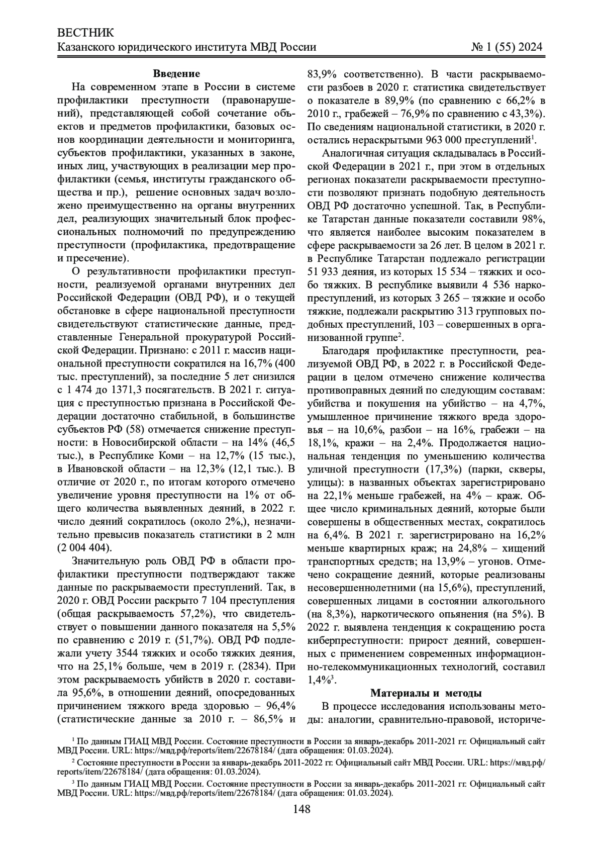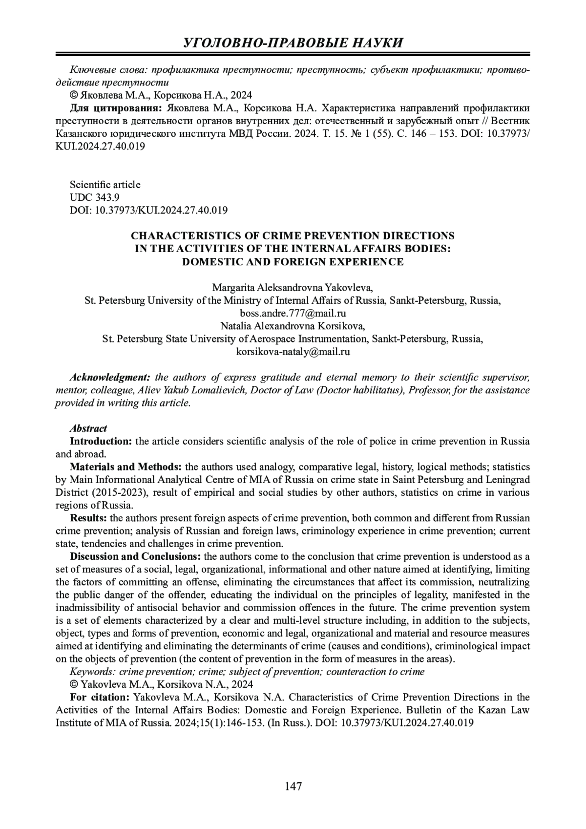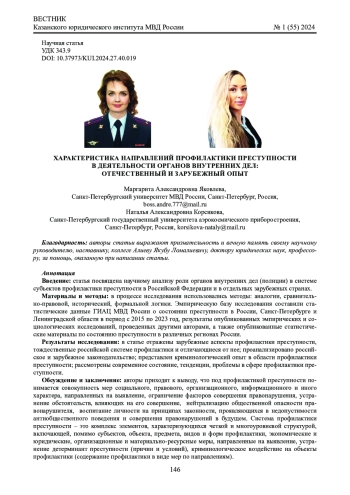 ЯКОВЛЕВА М. А., КОРСИКОВА Н. А. ХАРАКТЕРИСТИКА НАПРАВЛЕНИЙ ПРОФИЛАКТИКИ ПРЕСТУПНОСТИ В ДЕЯТЕЛЬНОСТИ ОРГАНОВ ВНУТРЕННИХ ДЕЛ: ОТЕЧЕСТВЕННЫЙ И ЗАРУБЕЖНЫЙ ОПЫТ // ВЕСТНИК КАЗАНСКОГО ЮРИДИЧЕСКОГО ИНСТИТУТА МВД РОССИИ. 2024. Т. 15 № 1 (55)
