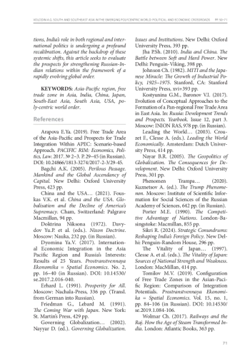 2. Дёмина Я.В. Процессы международной экономической интеграции в АТР и интересы России: итоги 25 лет // Пространственная экономика. - 2017. - № 2. - С. 16-40. - https://doi.org/10.14530/se.2017.2.016-040.