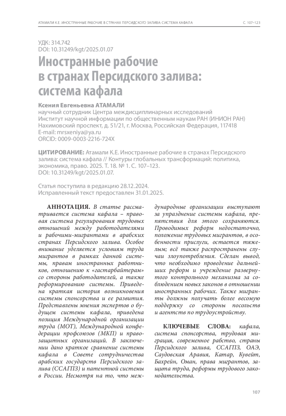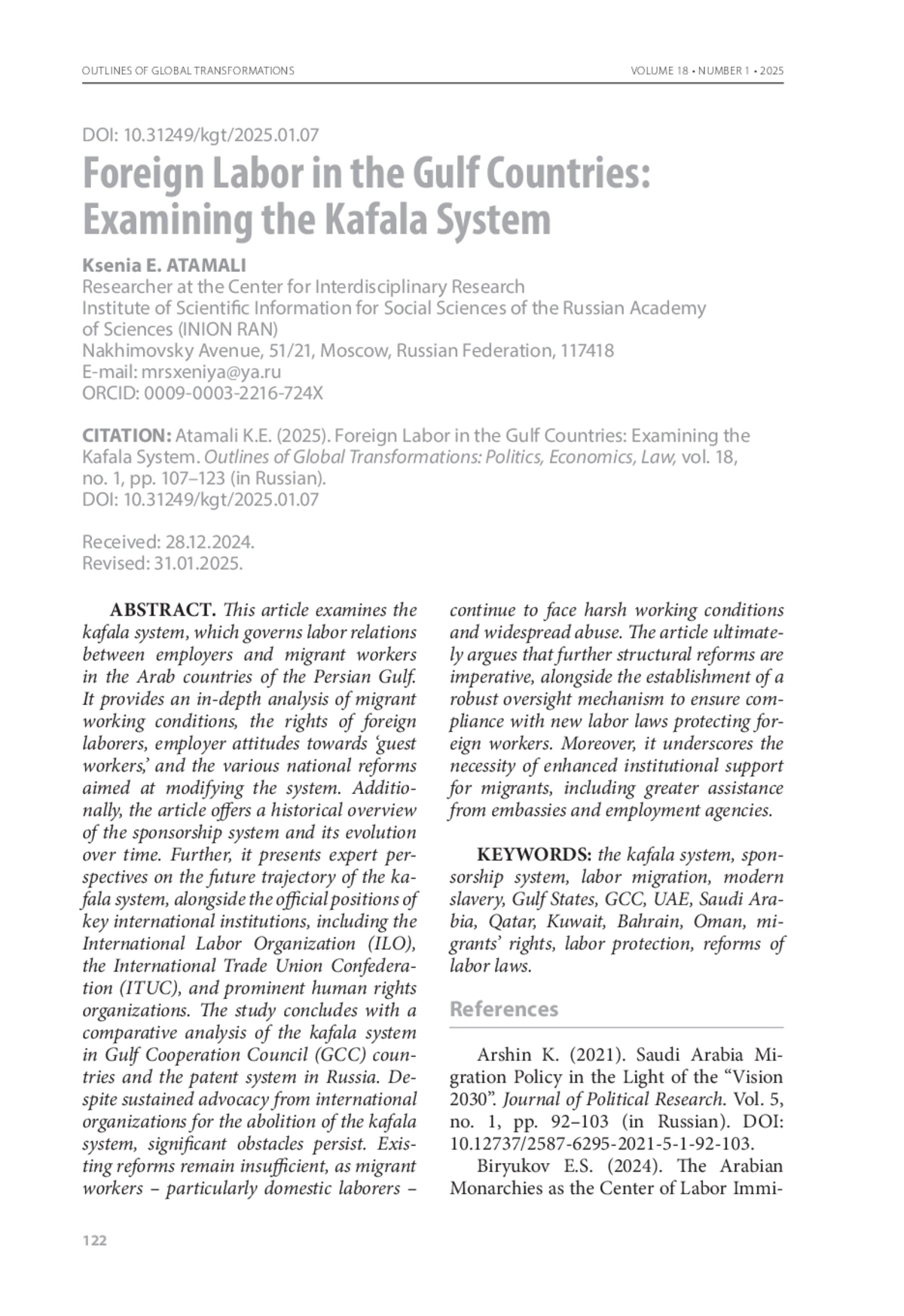 В статье рассматривается система кафала - правовая система регулирования трудовых отношений между работодателями и рабочими-мигрантами в арабских странах Персидского залива. Особое внимание уделяется условиям труда мигрантов в рамках данной системы, правам иностранных работников, отношению к «гастарбайтерам» со стороны работодателей, а также реформированию системы. Приведена краткая история возникновения системы спонсорства и ее развития. Представлены мнения экспертов о будущем системы кафала, приведена позиция Международной организации труда (МОТ), Международной конфедерации профсоюзов (МКП) и правозащитных организаций. В заключении дано краткое сравнение системы кафала в Совете сотрудничества арабских государств Персидского залива (ССАГПЗ) и патентной системы в России. Несмотря на то, что международные организации выступают за упразднение системы кафала, препятствия для этого сохраняются. Проводимых реформ недостаточно, положение трудовых мигрантов, в особенности прислуги, остается тяжелым; всё также распространены случаи злоупотребления. Сделан вывод, что необходимо проведение дальнейших реформ и учреждение развернутого контрольного механизма за соблюдением новых законов в отношении иностранных рабочих. Также мигранты должны получать более весомую поддержку со стороны посольств и агентств по трудоустройству.