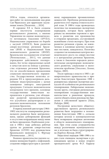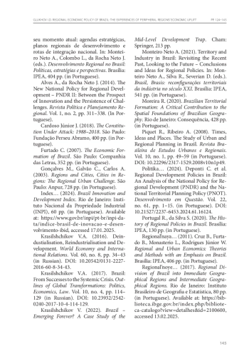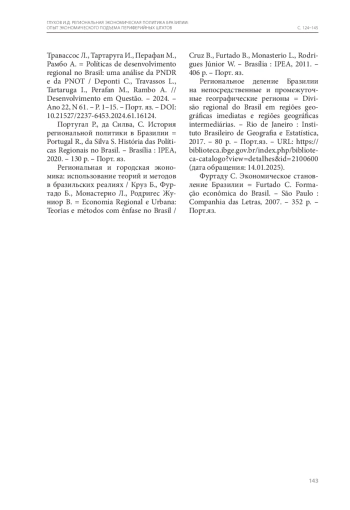 5. Алвес А., Коэльо В. Национальная политика регионального развития и ее современное состояние: стратегические программы, планы регионального развития и Национальные интеграционные маршруты = Alves A., Coêlho V. A PNDR e seu momento atual: agendas estrategicas, planos regionais de desenvolvimento e rotas de integração nacional // Desenvolvimento Regional no Brasil: Politicas, estrategias e perspectivas / Ed. por A. Monteiro Neto, L. Colombo, J. da Rocha Neto. - Brasilia : IPEA, 2023. - 404 p. - Порт. яз.