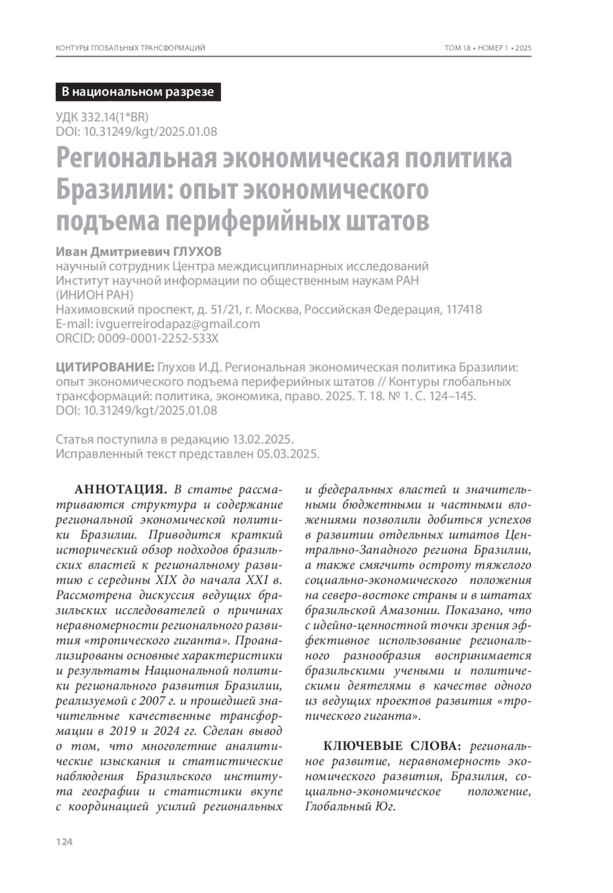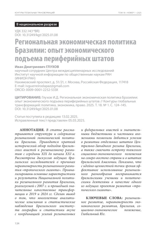 В статье рассматриваются структура и содержание региональной экономической политики Бразилии. Приводится краткий исторический обзор подходов бразильских властей к региональному развитию с середины XIX до начала XXI в. Рассмотрена дискуссия ведущих бразильских исследователей о причинах неравномерности регионального развития «тропического гиганта». Проанализированы основные характеристики и результаты Национальной политики регионального развития Бразилии, реализуемой с 2007 г. и прошедшей значительные качественные трансформации в 2019 и 2024 гг. Сделан вывод о том, что многолетние аналитические изыскания и статистические наблюдения Бразильского института географии и статистики вкупе с координацией усилий региональных и федеральных властей и значительными бюджетными и частными вложениями позволили добиться успехов в развитии отдельных штатов Центрально-Западного региона Бразилии, а также смягчить остроту тяжелого социально-экономического положения на северо-востоке страны и в штатах бразильской Амазонии. Показано, что с идейно-ценностной точки зрения эффективное использование регионального разнообразия воспринимается бразильскими учеными и политическими деятелями в качестве одного из ведущих проектов развития «тропического гиганта».
