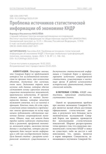 Популярно мнение, что Северная Корея не представляет интереса для исследователей-экономистов по причине того, что количество объектов, доступных для изучения, очень мало. Экономика страны мало изучена: ведь данные, которые обычно составляют основу серьезного анализа социально-экономических показателей, практически недоступны. И препятствием является не только достоверность данных, которые зачастую вызывают сомнения, но и их наличие в принципе. Конечно, там, где есть спрос, в конечном итоге появится и предложение: многие организации по всему миру начали публиковать собственные оценочные данные северокорейской экономики. Однако, зная, как может быть трудно найти надежную статистику даже в развитой, прозрачной экономике, возникает вопрос, насколько точны данные о государстве, которое рассматривает даже малую часть информации о себе как государственную тайну. Цель данной статьи - раскрыть исторический контекст существования и доступности статистической информации о Северной Корее и проанализировать источники северокорейской статистики, существующие в настоящее время. В работе используются исторический, сравнительный, статистический методы.