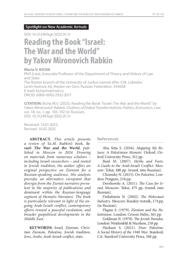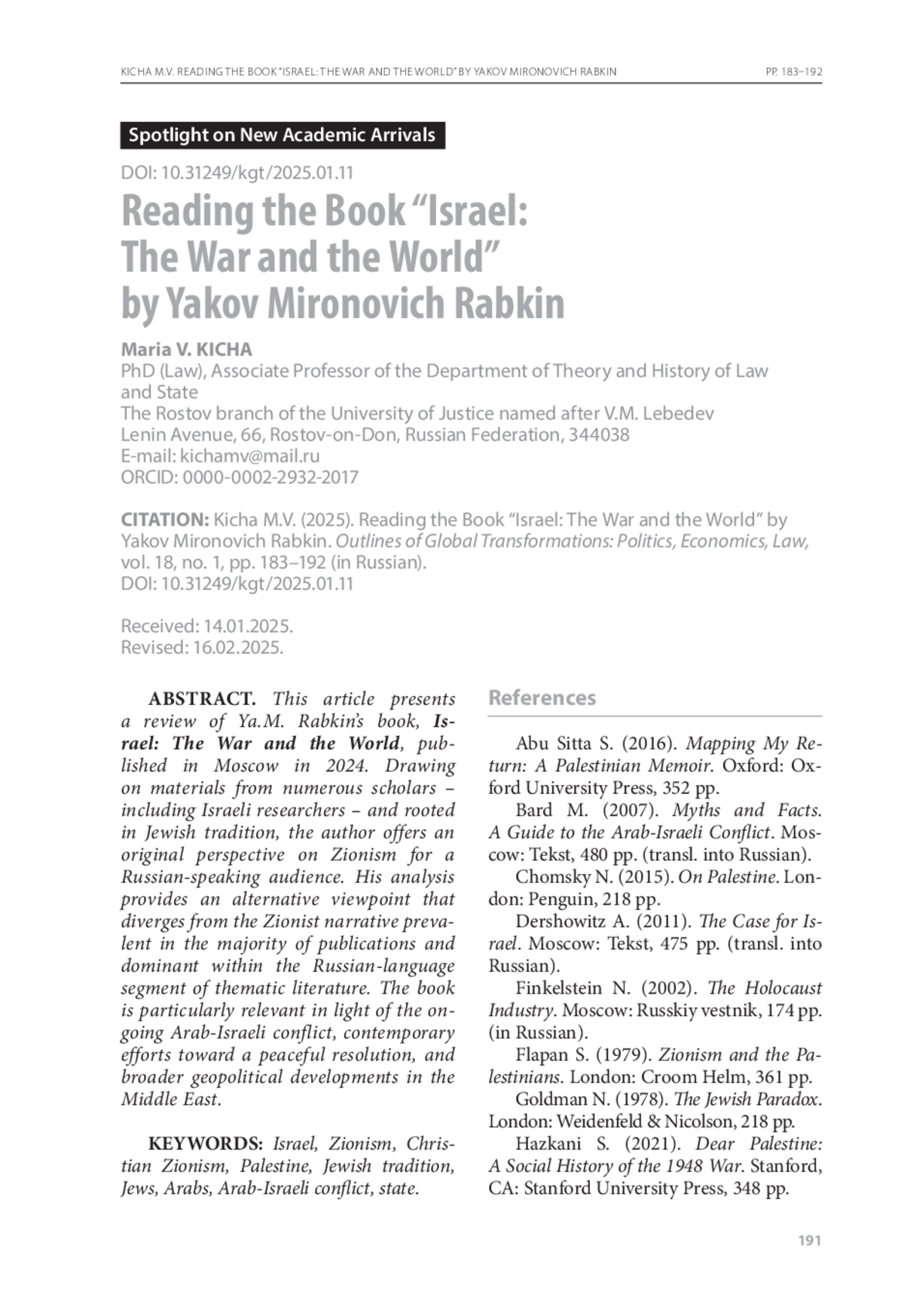 В статье представлена рецензия на книгу Я. М. Рабкина «Израиль: война и мiръ», вышедшую в Москве в 2024 г. Автор, опираясь на материалы многочисленных (в том числе израильских) исследователей и исходя из иудейской традиции, предлагает оригинальный для русскоязычной аудитории взгляд на сионизм, а также историю и сущность Государства Израиль; взгляд, альтернативный сионистской точке зрения, изложенной в подавляющем большинстве публикаций и доминирующей в русскоязычном сегменте тематической литературы. Особую актуальность данная книга приобретает в контексте нового витка арабо-израильского конфликта и актуальных попыток мирного урегулирования, а также значимых геополитических процессов в регионе Ближнего Востока.