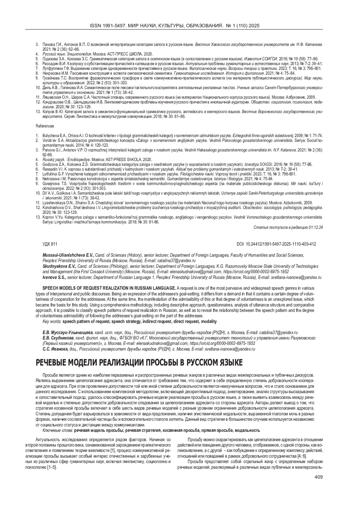 МЕХРАБИ К. ВЛИЯНИЕ ЗАЛОГА ПРИЧАСТИЙ НА ПРАГМАТИЧЕСКОЕ ВОСПРИЯТИЕ ВЫСКАЗЫВАНИЯ // МИР НАУКИ, КУЛЬТУРЫ, ОБРАЗОВАНИЯ. 2025. № 1 (110)