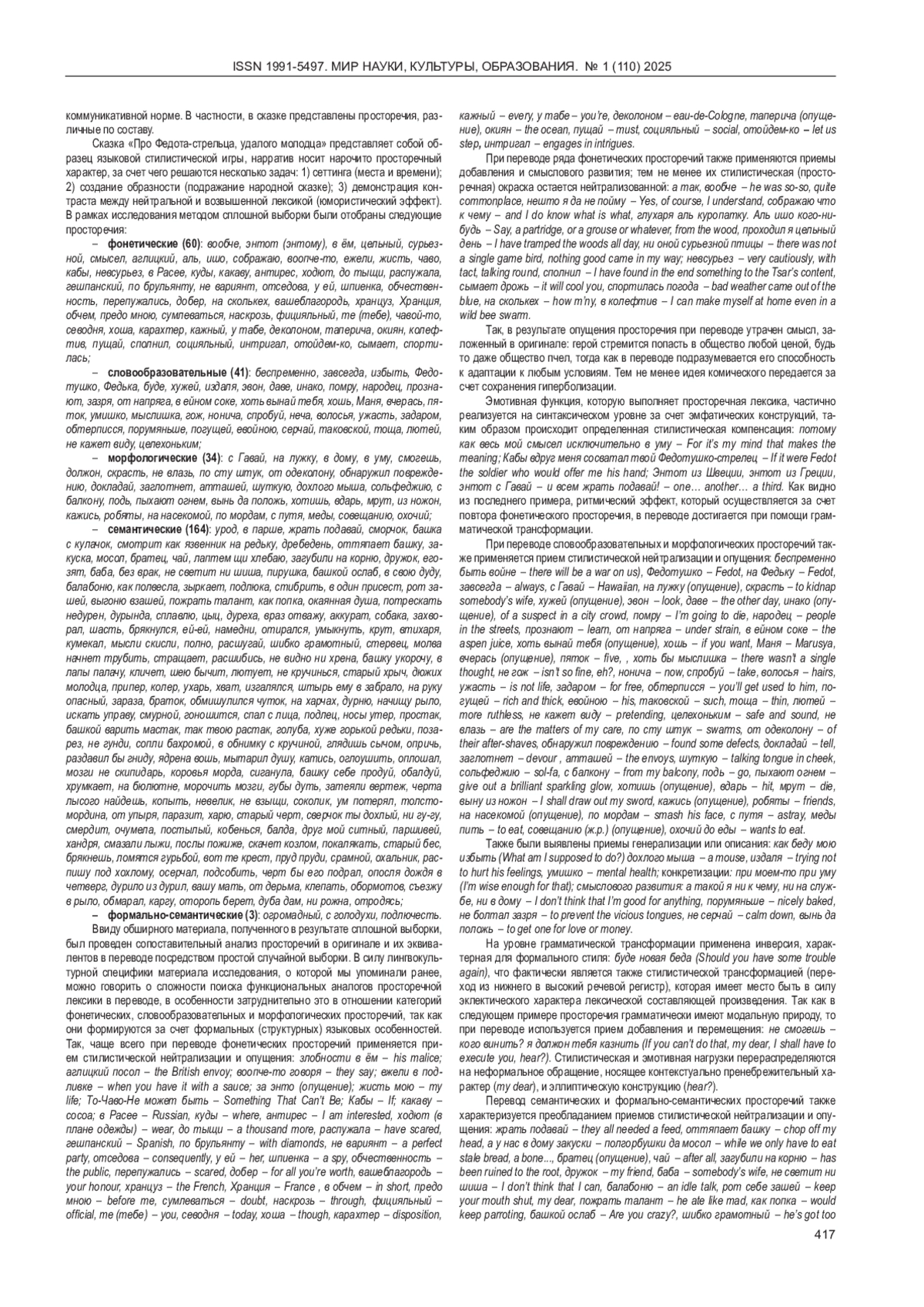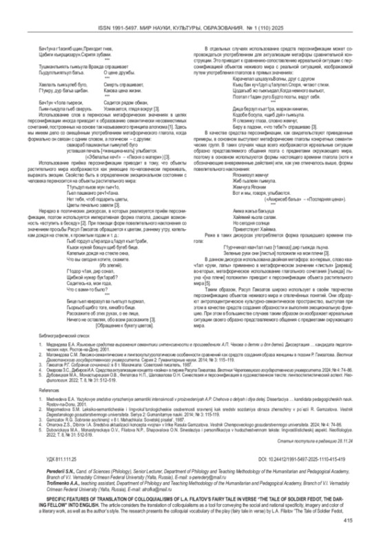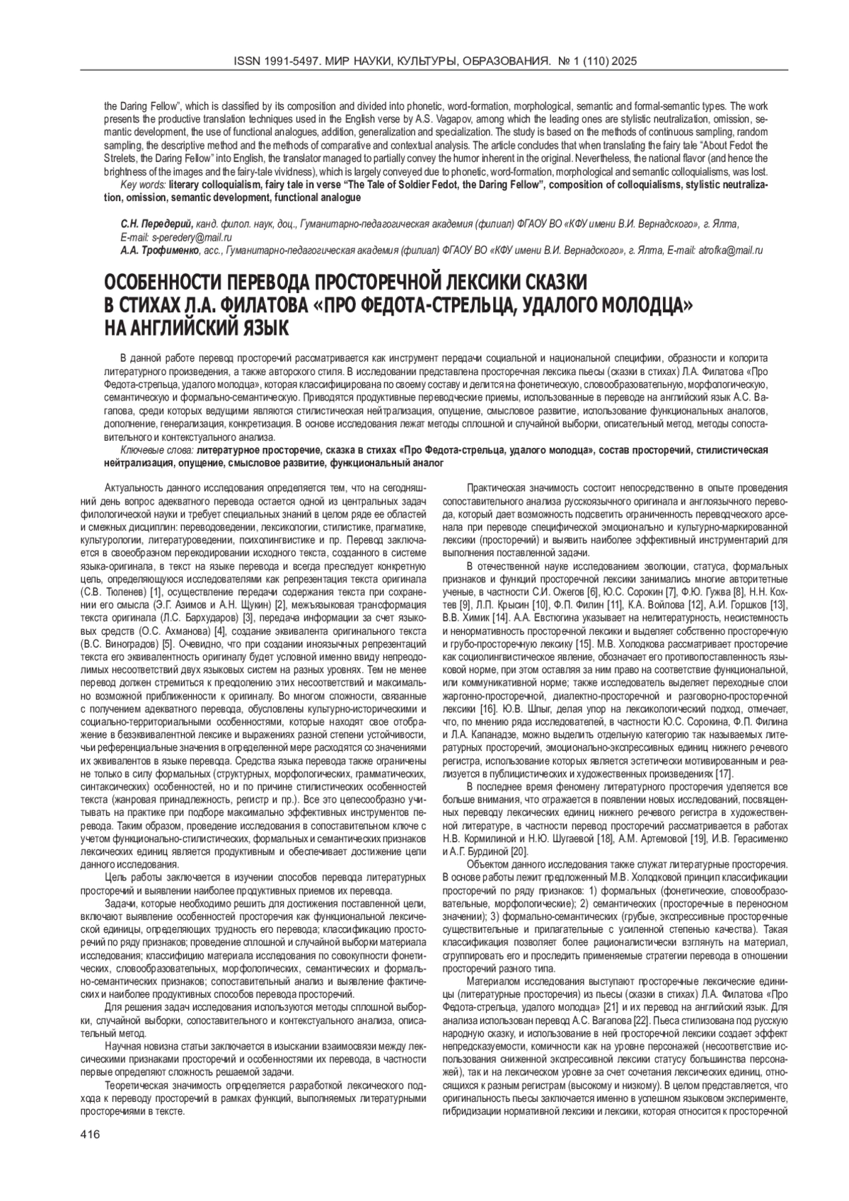 ПЕРЕДЕРИЙ С. Н., ТРОФИМЕНКО А. А. ОСОБЕННОСТИ ПЕРЕВОДА ПРОСТОРЕЧНОЙ ЛЕКСИКИ СКАЗКИ В СТИХАХ Л. А. ФИЛАТОВА «ПРО ФЕДОТА-СТРЕЛЬЦА, УДАЛОГО МОЛОДЦА» НА АНГЛИЙСКИЙ ЯЗЫК // МИР НАУКИ, КУЛЬТУРЫ, ОБРАЗОВАНИЯ. 2025. № 1 (110)