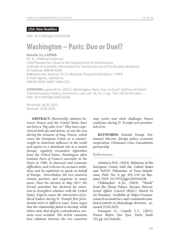 Исторически отношения между Францией и США никогда не были «большой спокойной рекой». В них подъемы сменялись спадами, как это было в момент вторжения в Ирак. Франция, рассматривающая Европейский союз (ЕС) как противовес американскому влиянию в мире и претендующая на главенствующую роль в объединенной Европе, регулярно сталкивается с противодействием США, которые напоминают французам о позорной сдаче страны нацистам в 1940 г., сложностях в области финансов и экономики, критикуют непомерные амбиции Франции и ее стремление говорить от имени Европы. Это не мешает двум странам оставаться партнерами и сотрудничать во многих сферах. C момента избрания на пост президента в мае 2017 г. Э. Макрон заявил о своем намерении выстроить прочные отношения с США. Эксперты по‑разному оценивают взаимодействие политиков в первый президентский срок Д. Трампа. Одни считают, что отношения между ними не сложились, другие замечают, что, несмотря на противоречия, им удавалось избегать напряжений. Нас интересовало, как будут складываться отношения между двумя странами и с какими вызовами столкнется Франция в новый президентский срок Д. Трампа.