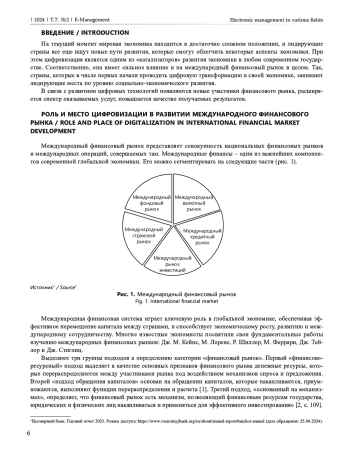 Цифровизация – один из «катализаторов» развития экономики в любом современном государстве. Соответственно, она имеет сильное влияние на международный финансовый рынок в целом. Страны, которые в числе первых начали проводить цифровую трансформацию в своей экономике, занимают лидирующие места по уровню социально-экономического развития. На данный момент мировая экономика находится в достаточно сложном положении, и лидирующие страны все еще ищут новые пути развития, которые смогут облегчить некоторые аспекты экономики. Необходимость быстрого внедрения и адаптации международного финансового рынка к цифровым технологиям и трансформация международных валютно-кредитных отношений – вот основные тенденции развития цифровизации международного финансового рынка в современных условиях. В связи с развитием цифровых технологий появляются новые участники финансового рынка, расширяется спектр оказываемых услуг, повышается качество получаемых результатов.