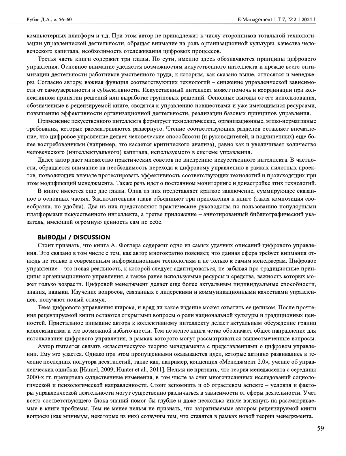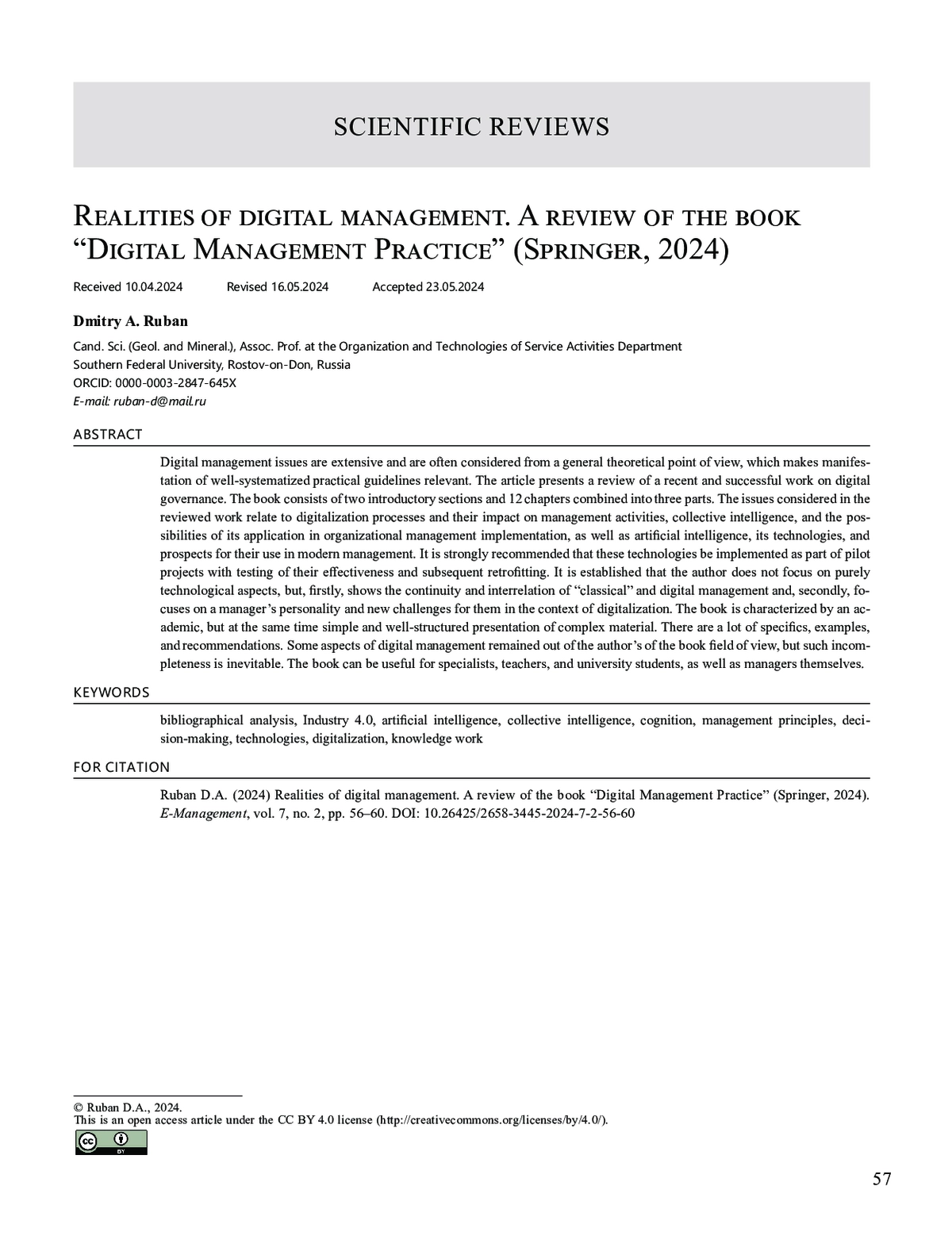 Проблематика цифрового управления обширна и зачастую рассматривается с общетеоретической точки зрения, что делает актуальным проявление хорошо систематизированных практических руководств. Настоящая статья представляет рецензию на свежую и при этом удачную работу, посвященную цифровому управлению. Книга состоит из двух вводных разделов и 12 глав, объединенных в три части. Вопросы, рассматриваемые в рецензируемой работе, касаются процессов цифровизации и их влияния на управленческую деятельность, коллективного интеллекта и возможностей его применения при осуществлении организационного менеджмента, а также искусственного интеллекта, его технологий и перспектив их использования в современном управлении. Настоятельно рекомендуется внедрение этих технологий в рамках пилотных проектов с тестированием их эффективности и последующей донастройкой. Автор книги не концентрируется на сугубо технологических аспектах, а, во-первых, показывает преемственность и взаимосвязь «классического» и цифрового управления и, во-вторых, акцентирует внимание на личности менеджера и новых вызовах для него в условиях цифровизации. Для книги характерна академическая, но при этом простая и хорошо структурированная подача сложного материала. Много конкретики, примеров, рекомендаций. Некоторые аспекты цифрового управления остались вне поля зрения автора, однако такая неполнота неизбежна. Книга может быть полезна специалистам, преподавателям и студентам университетов, а также собственно управленцам.