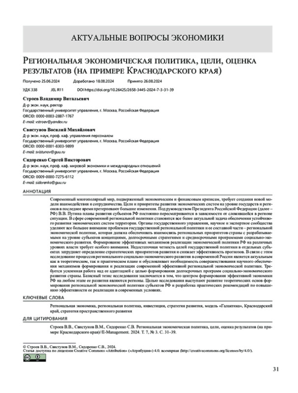 Современный многополярный мир, подверженный экономическим и финансовым кризисам, требует создания новой модели взаимодействия и сотрудничества. Цели и приоритеты развития экономических систем на уровне государств и регионов в последнее время претерпевают большие изменения. Под руководством Президента Российской Федерации (далее – РФ) В. В. Путина планы развития субъектов РФ постоянно пересматриваются в зависимости от сложившейся в регионе ситуации. В сфере современной региональной политики становится все более актуальной задача обеспечения устойчивого развития экономических систем территории. Органы государственного управления, научное и экспертное сообщества уделяют все большее внимание проблемам государственной региональной политики и ее составной части – региональной экономической политике, которая должна обеспечивать взаимосвязь региональных приоритетов страны с разрабатываемыми на уровне субъектов концепциями, долгосрочными стратегиями и среднесрочными программами социально-экономического развития. Формирование эффективных механизмов реализации экономической политики РФ на различных уровнях власти требует особого внимания. Недостаточная четкость целей государственной политики в отдельных субъектах затрудняет определение стратегических приоритетов развития и снижает эффективность прогнозов. В связи с этим исследование процессов регионального социально-экономического развития в современной России является актуальным как в теоретическом, так и практическом плане и обусловливает необходимость совершенствования научного обеспечения механизмов формирования и реализации современной эффективной региональной экономической политики. Требуется усиленная работа над ее адаптацией с целью формирования долгосрочных программ социально-экономического развития страны. Базисный тезис исследования заключается в том, что центром формирования эффективной экономики РФ на любом этапе ее развития являются регионы. Целью исследования выступают развитие теоретических основ формирования региональной экономической политики субъектов РФ и разработка практических рекомендаций по повышению эффективности ее реализации в современных условиях.
