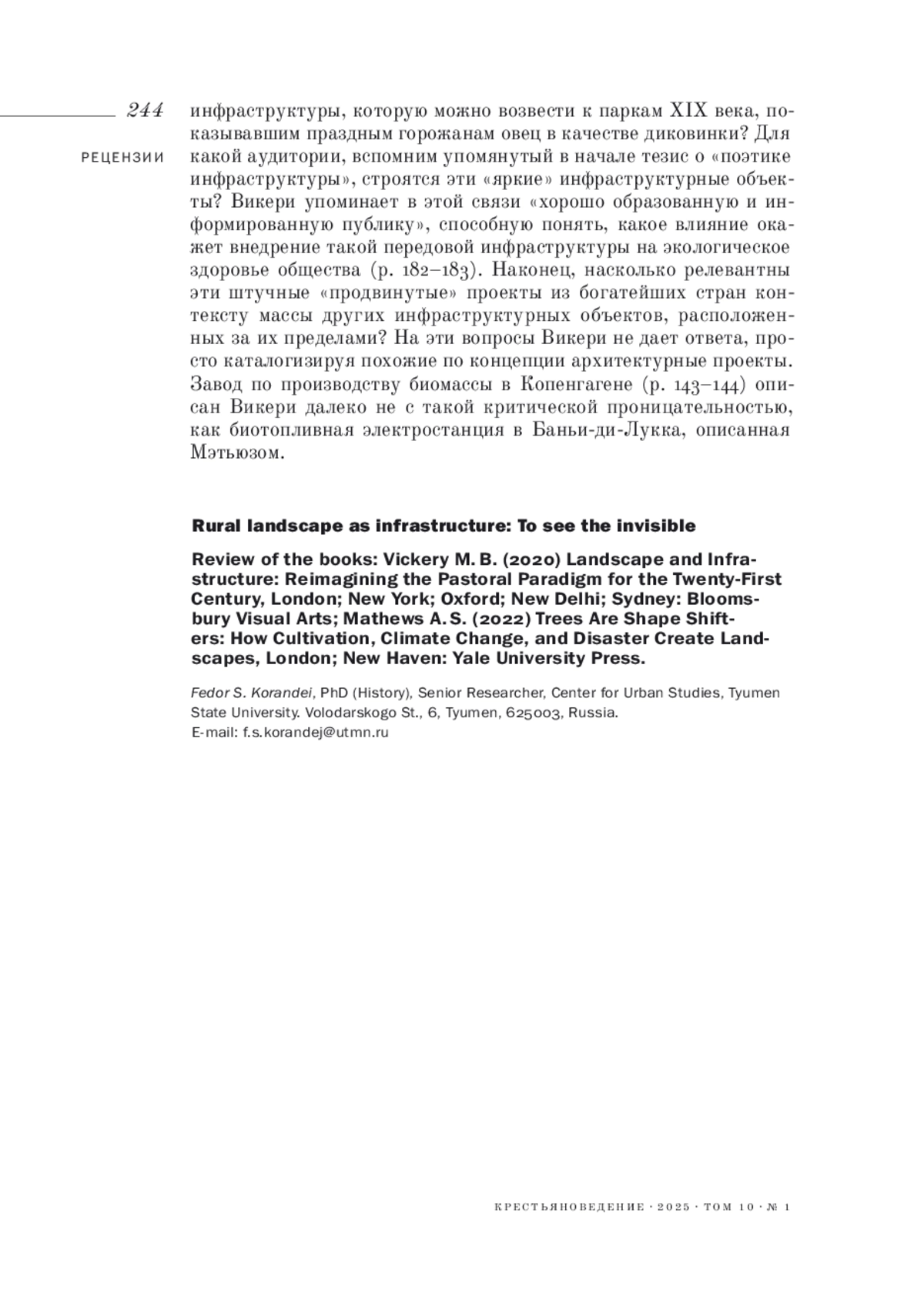 Рецензия на книги: Vickery M. B. (2020). Landscape and Infrastructure: Reimagining the Pastoral Paradigm for the Twenty-First Century. London, New York, Oxford, New Delhi, Sydney: Bloomsbury Visual Arts. Mathews A. S. (2022). Trees Are Shape Shifters: How Cultivation, Climate Change, and Disaster Create Landscapes. London, New Haven: Yale University Press.