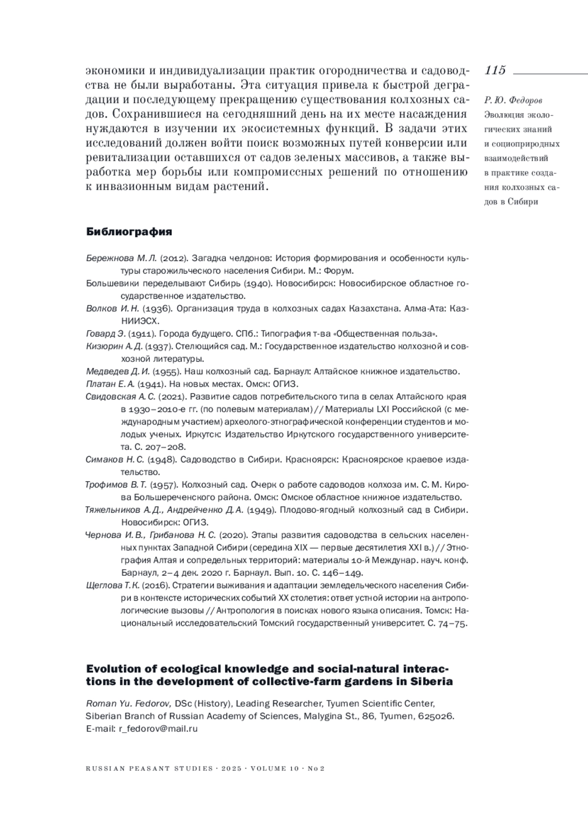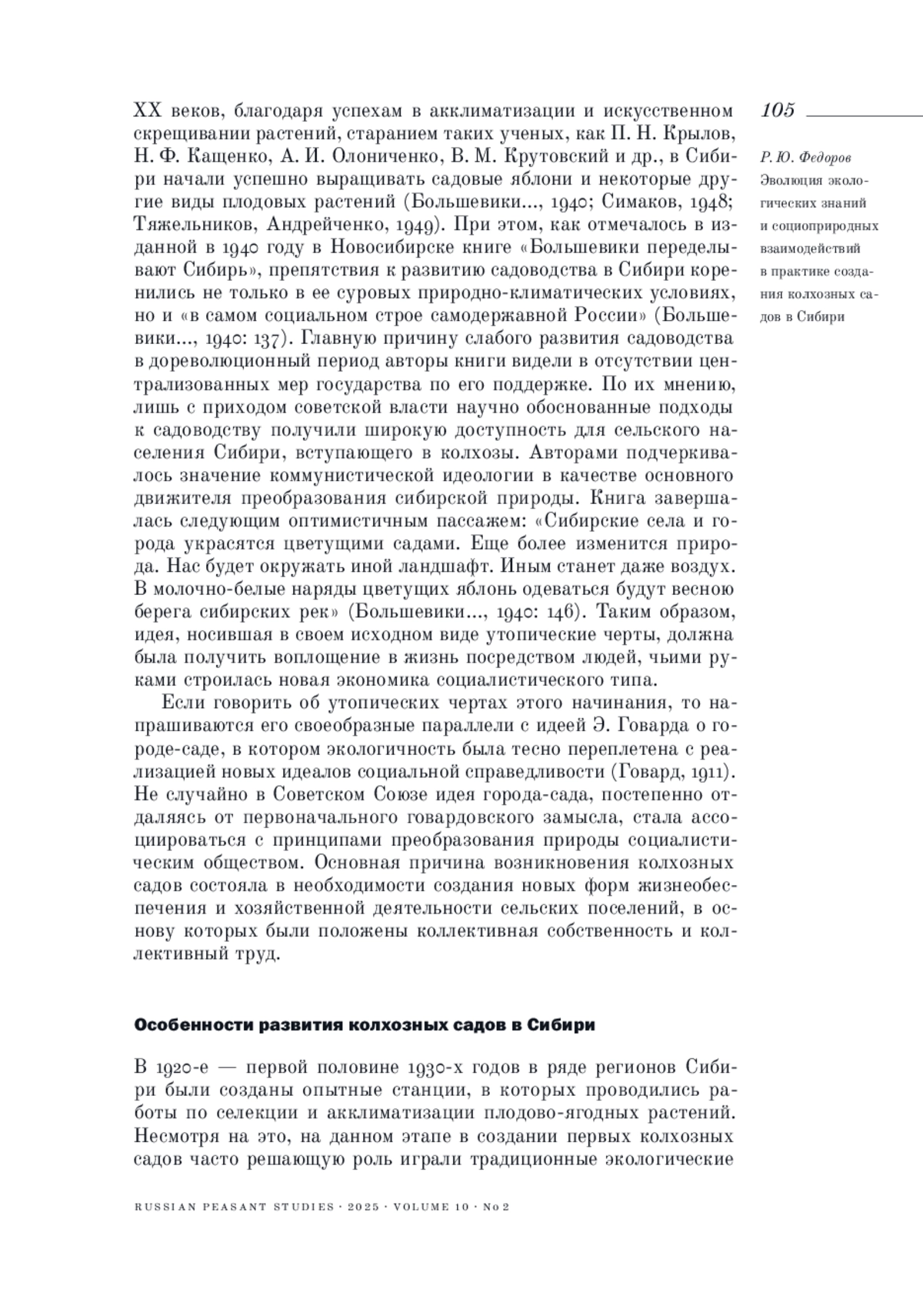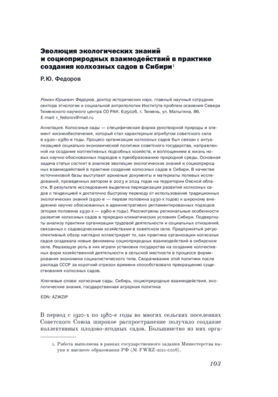 ФЕДОРОВ Р. Ю. ЭВОЛЮЦИЯ ЭКОЛОГИЧЕСКИХ ЗНАНИЙ И СОЦИОПРИРОДНЫХ ВЗАИМОДЕЙСТВИЙ В ПРАКТИКЕ СОЗДАНИЯ КОЛХОЗНЫХ САДОВ В СИБИРИ // КРЕСТЬЯНОВЕДЕНИЕ. 2025. Т. 10 № 2
