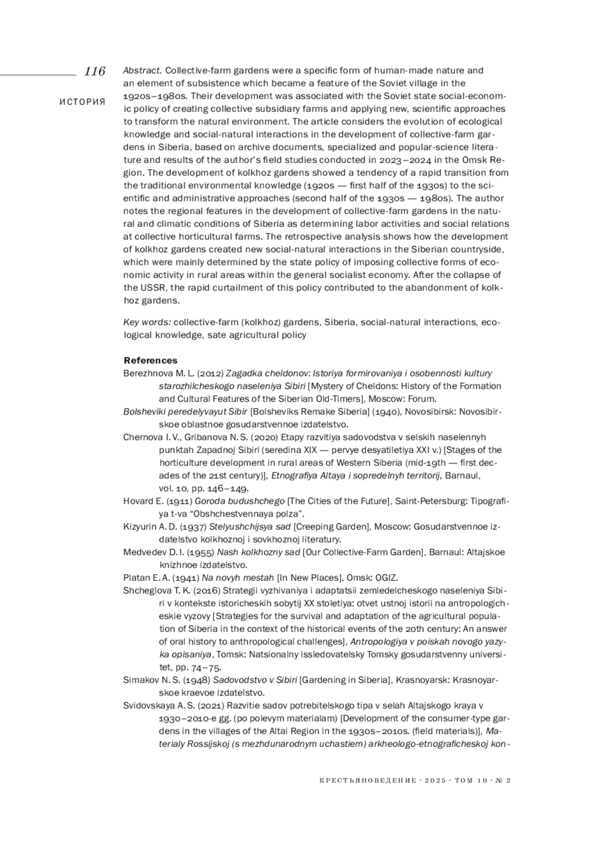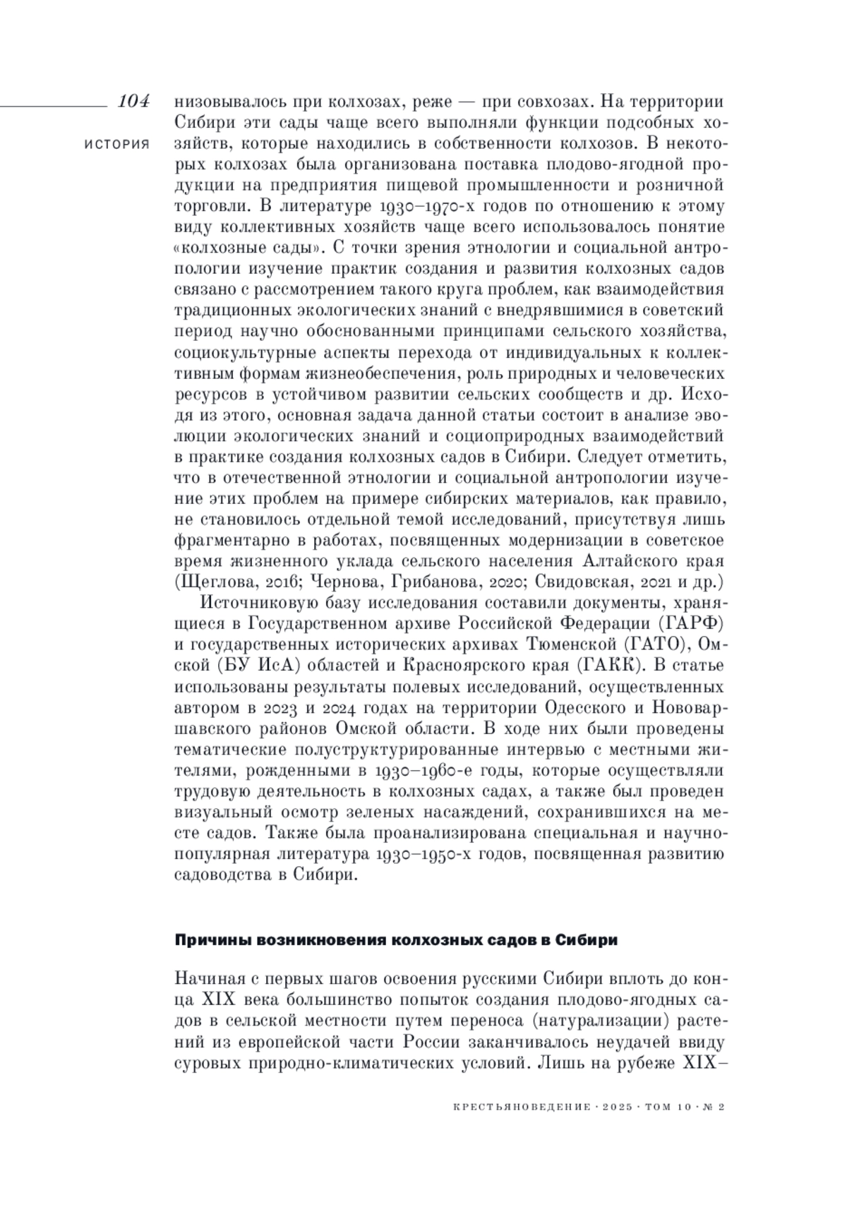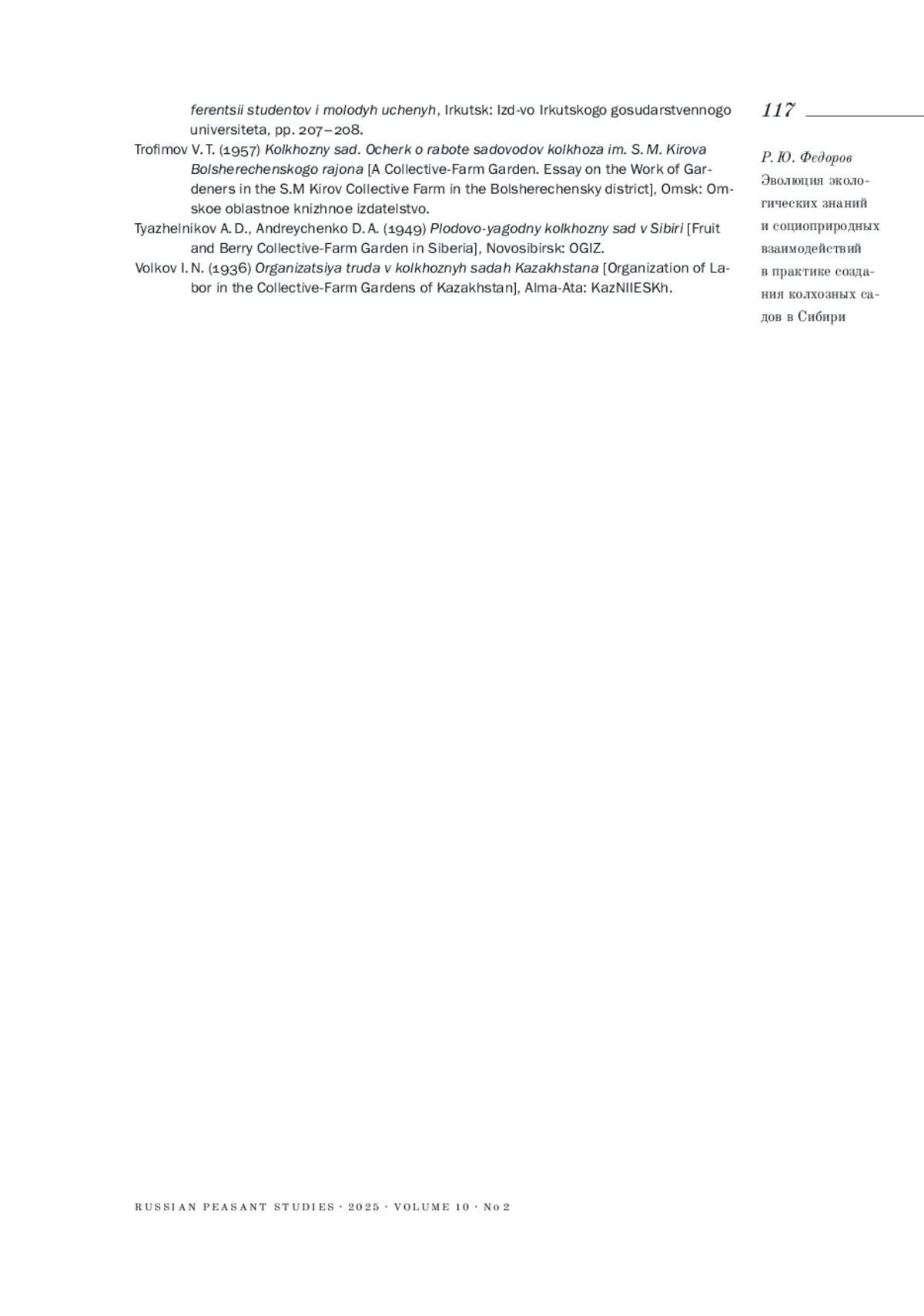 ФЕДОРОВ Р. Ю. ЭВОЛЮЦИЯ ЭКОЛОГИЧЕСКИХ ЗНАНИЙ И СОЦИОПРИРОДНЫХ ВЗАИМОДЕЙСТВИЙ В ПРАКТИКЕ СОЗДАНИЯ КОЛХОЗНЫХ САДОВ В СИБИРИ // КРЕСТЬЯНОВЕДЕНИЕ. 2025. Т. 10 № 2