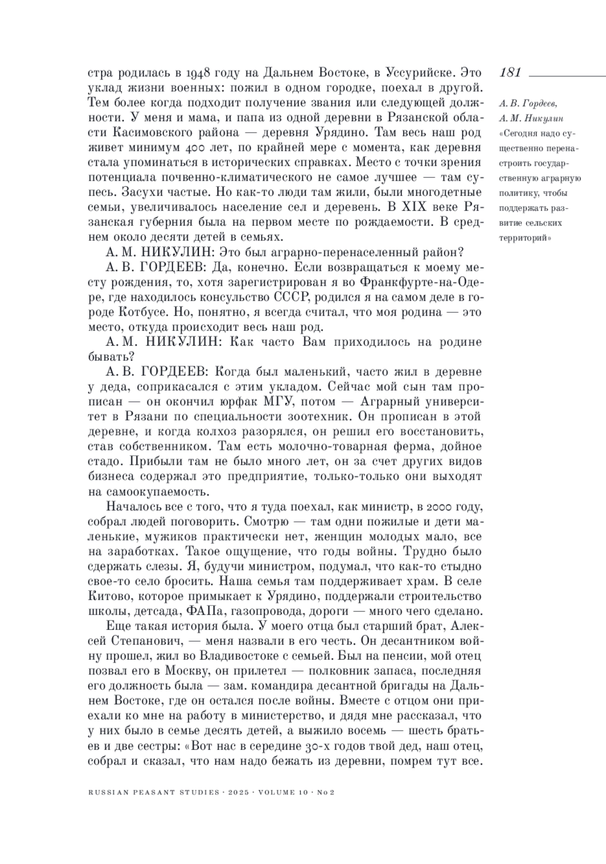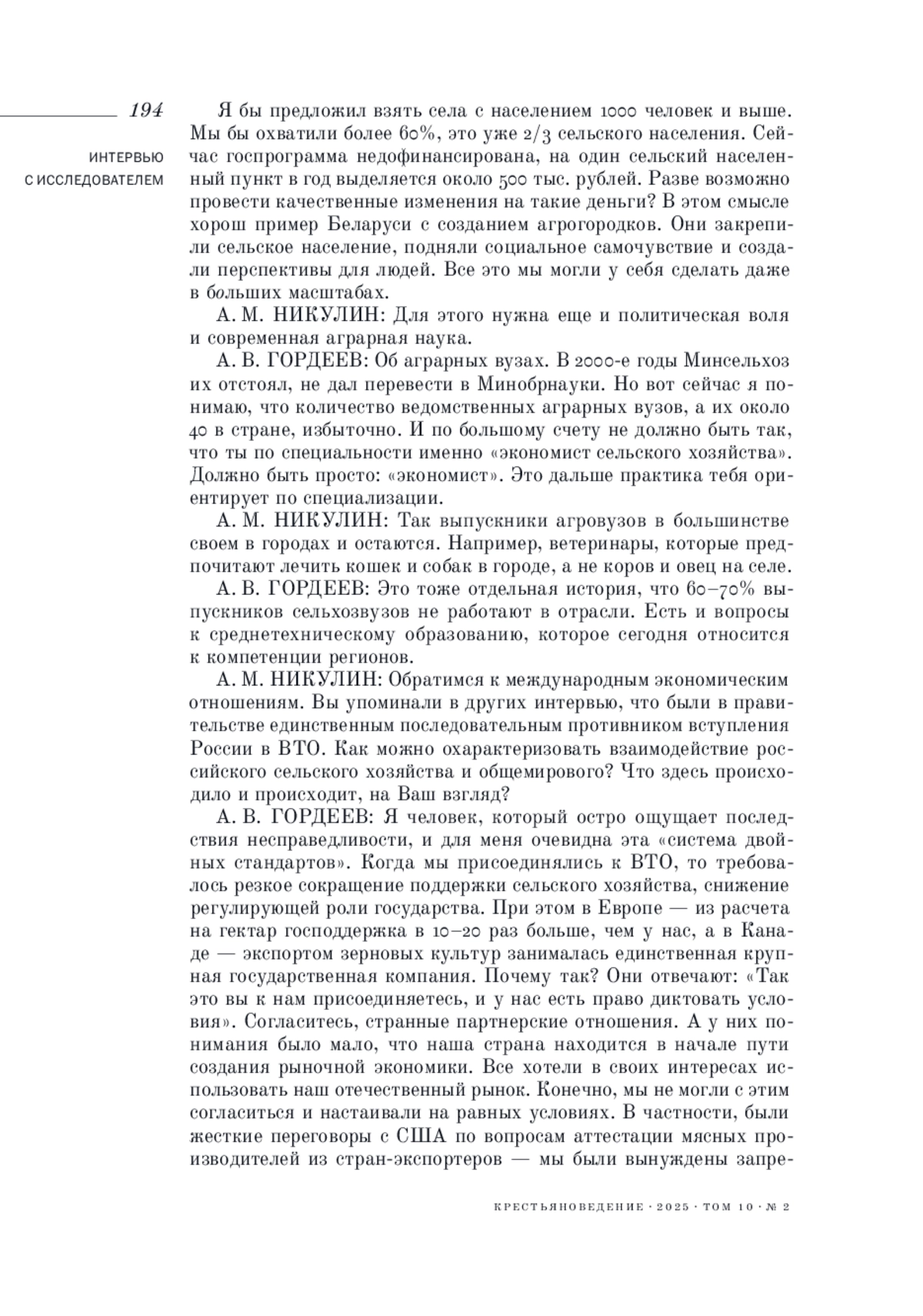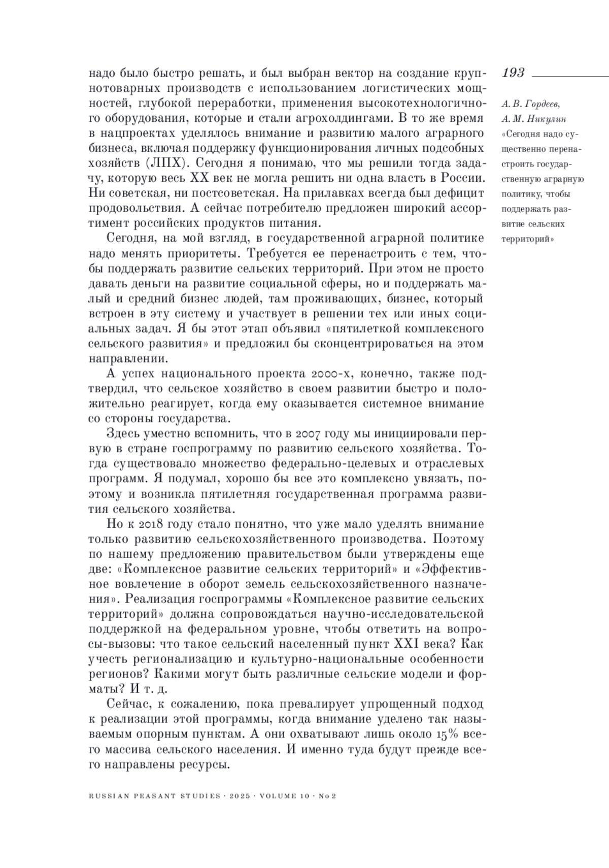 ГОРДЕЕВ А. В., НИКУЛИН А. М. «СЕГОДНЯ НАДО СУЩЕСТВЕННО ПЕРЕНАСТРОИТЬ ГОСУДАРСТВЕННУЮ АГРАРНУЮ ПОЛИТИКУ, ЧТОБЫ ПОДДЕРЖАТЬ РАЗВИТИЕ СЕЛЬСКИХ ТЕРРИТОРИЙ» // КРЕСТЬЯНОВЕДЕНИЕ. 2025. Т. 10 № 2