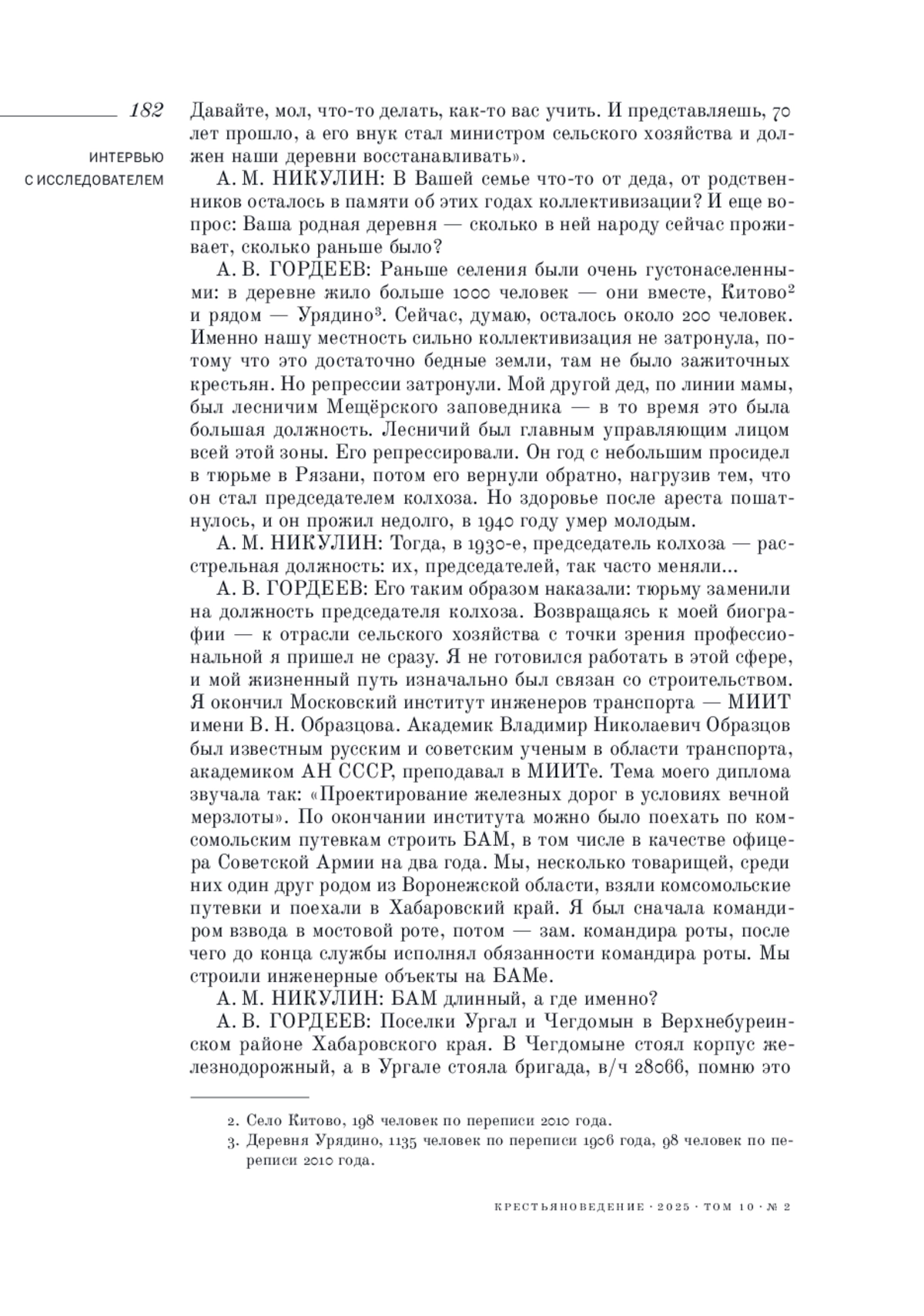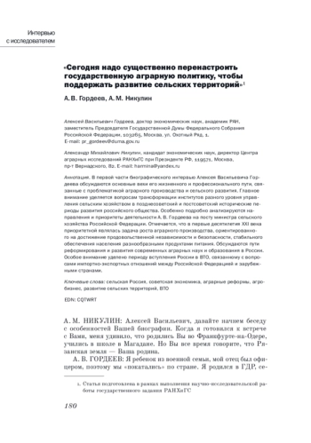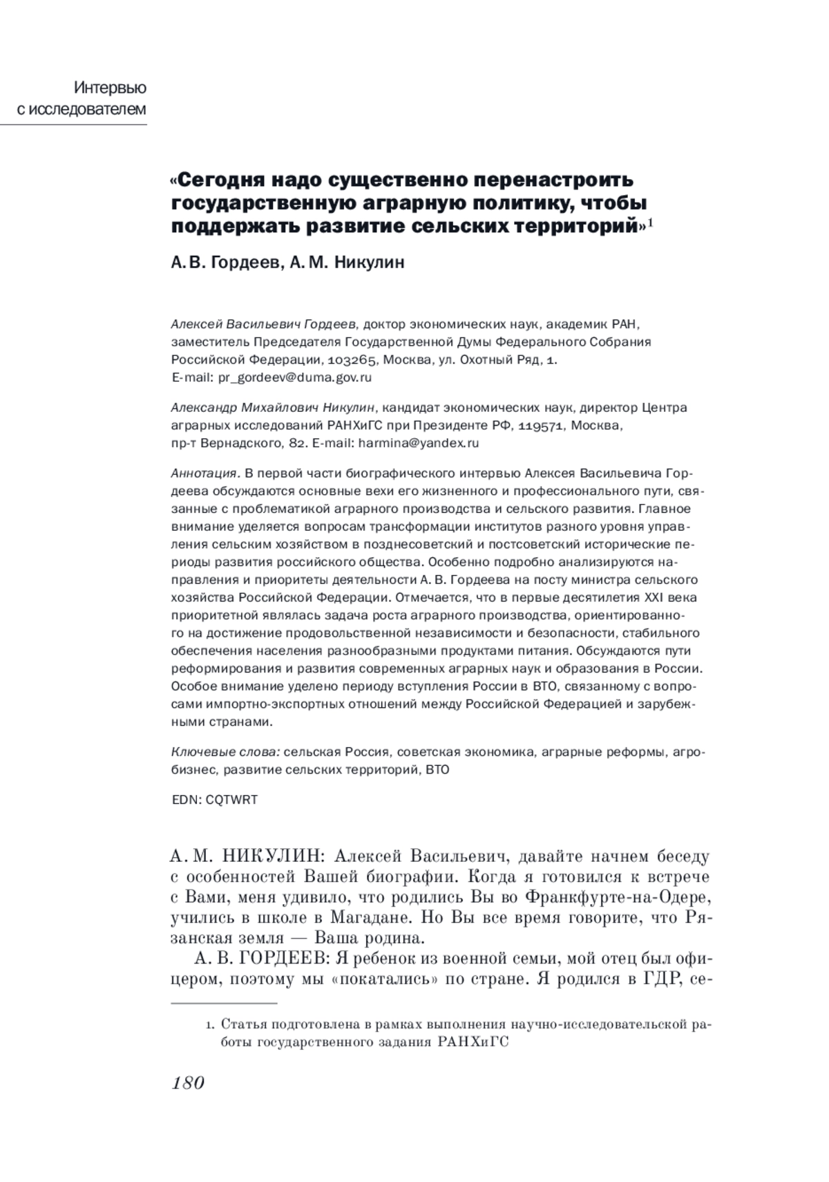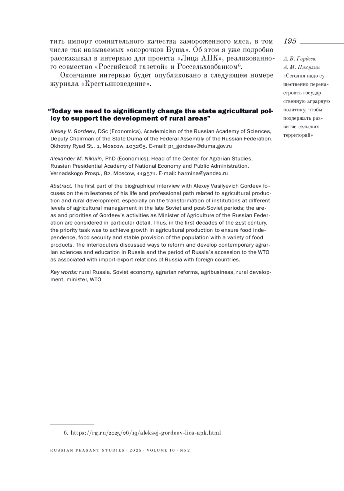 ГОРДЕЕВ А. В., НИКУЛИН А. М. «СЕГОДНЯ НАДО СУЩЕСТВЕННО ПЕРЕНАСТРОИТЬ ГОСУДАРСТВЕННУЮ АГРАРНУЮ ПОЛИТИКУ, ЧТОБЫ ПОДДЕРЖАТЬ РАЗВИТИЕ СЕЛЬСКИХ ТЕРРИТОРИЙ» // КРЕСТЬЯНОВЕДЕНИЕ. 2025. Т. 10 № 2