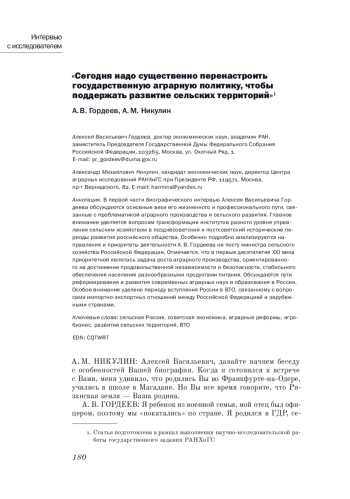 В первой части биографического интервью Алексея Васильевича Гордеева обсуждаются основные вехи его жизненного и профессионального пути, связанные с проблематикой аграрного производства и сельского развития. Главное внимание уделяется вопросам трансформации институтов разного уровня управления сельским хозяйством в позднесоветский и постсоветский исторические периоды развития российского общества. Особенно подробно анализируются направления и приоритеты деятельности А. В. Гордеева на посту министра сельского хозяйства Российской Федерации. Отмечается, что в первые десятилетия XXI века приоритетной являлась задача роста аграрного производства, ориентированного на достижение продовольственной независимости и безопасности, стабильного обеспечения населения разнообразными продуктами питания. Обсуждаются пути реформирования и развития современных аграрных наук и образования в России. Особое внимание уделено периоду вступления России в ВТО, связанному с вопросами импортно-экспортных отношений между Российской Федерацией и зарубежными странами.